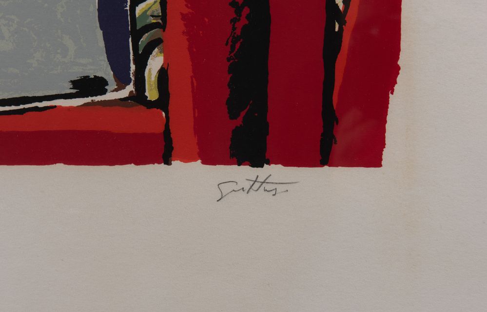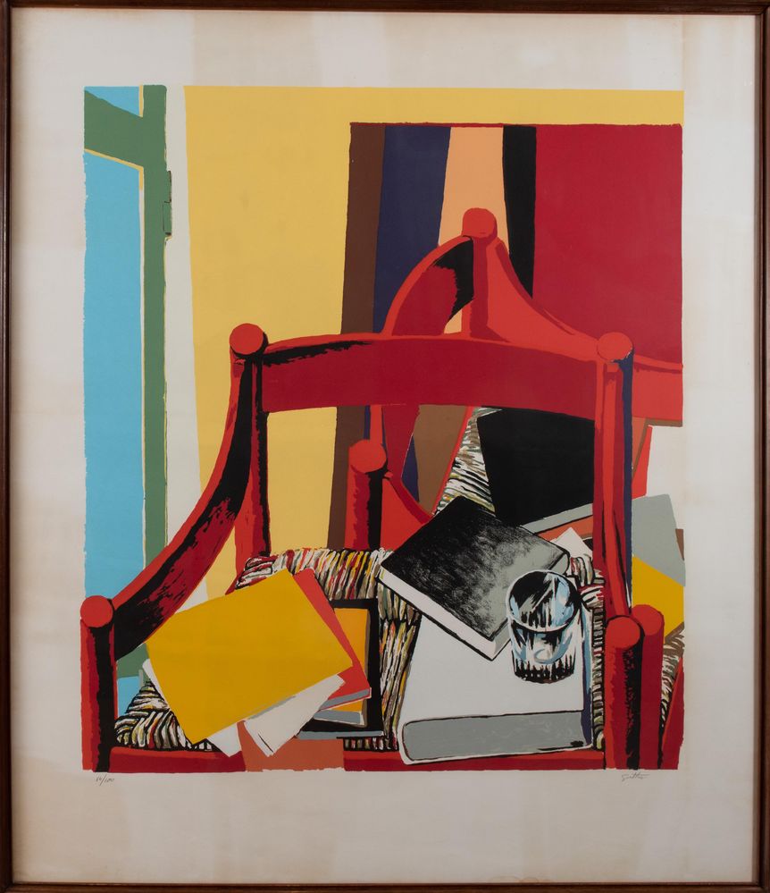 RENATO GUTTUSO (Bagheria 1911 - Roma 1987) "Natura morta con sedia". Litografia a colori su carta. Cm 136x116. Opera firmata in basso a destra Guttuso. Reca numeri di tiratura in basso a sinistra 64/100.