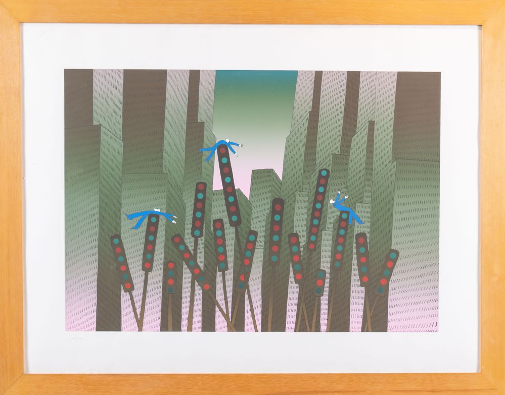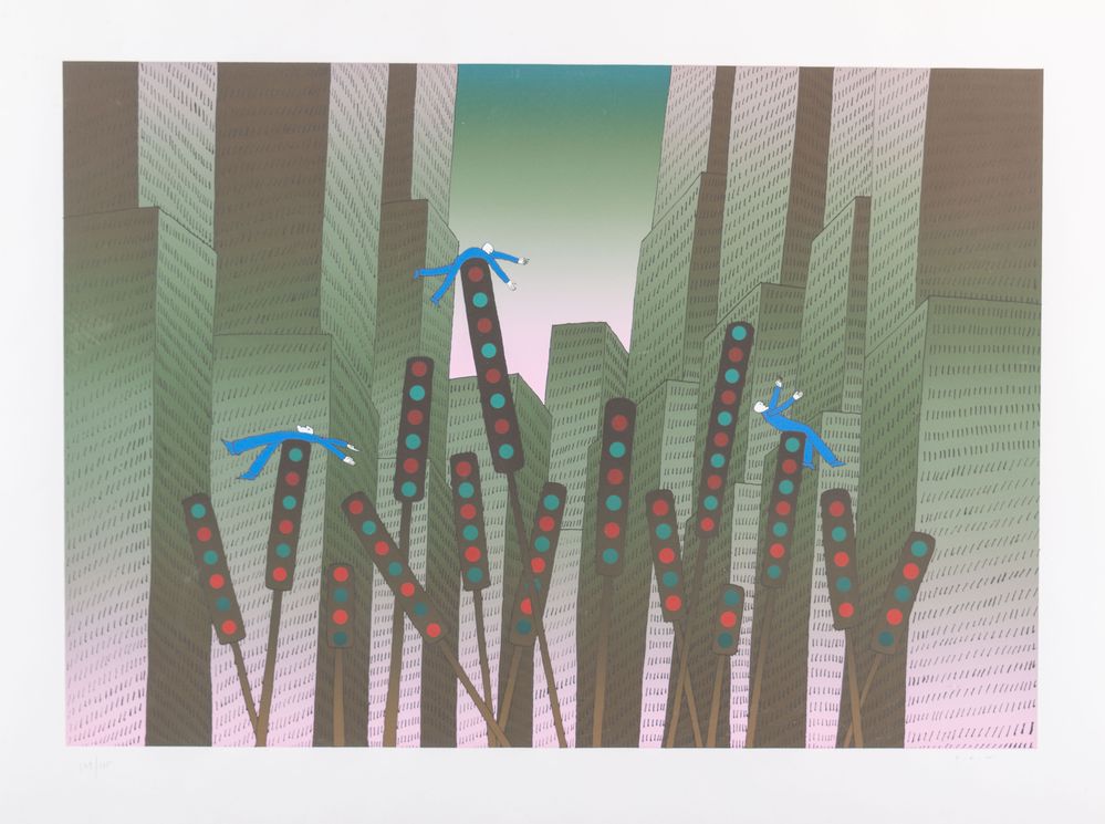 JEAN-MICHEL FOLON (Uccle 1934 – Principato di Monaco 2005) "Senza titolo". Litografia a colori su carta. Cm 69x90. Opera firmata in basso a destra Folon. Reca numeri di tiratura in basso a sinistra 129/135.