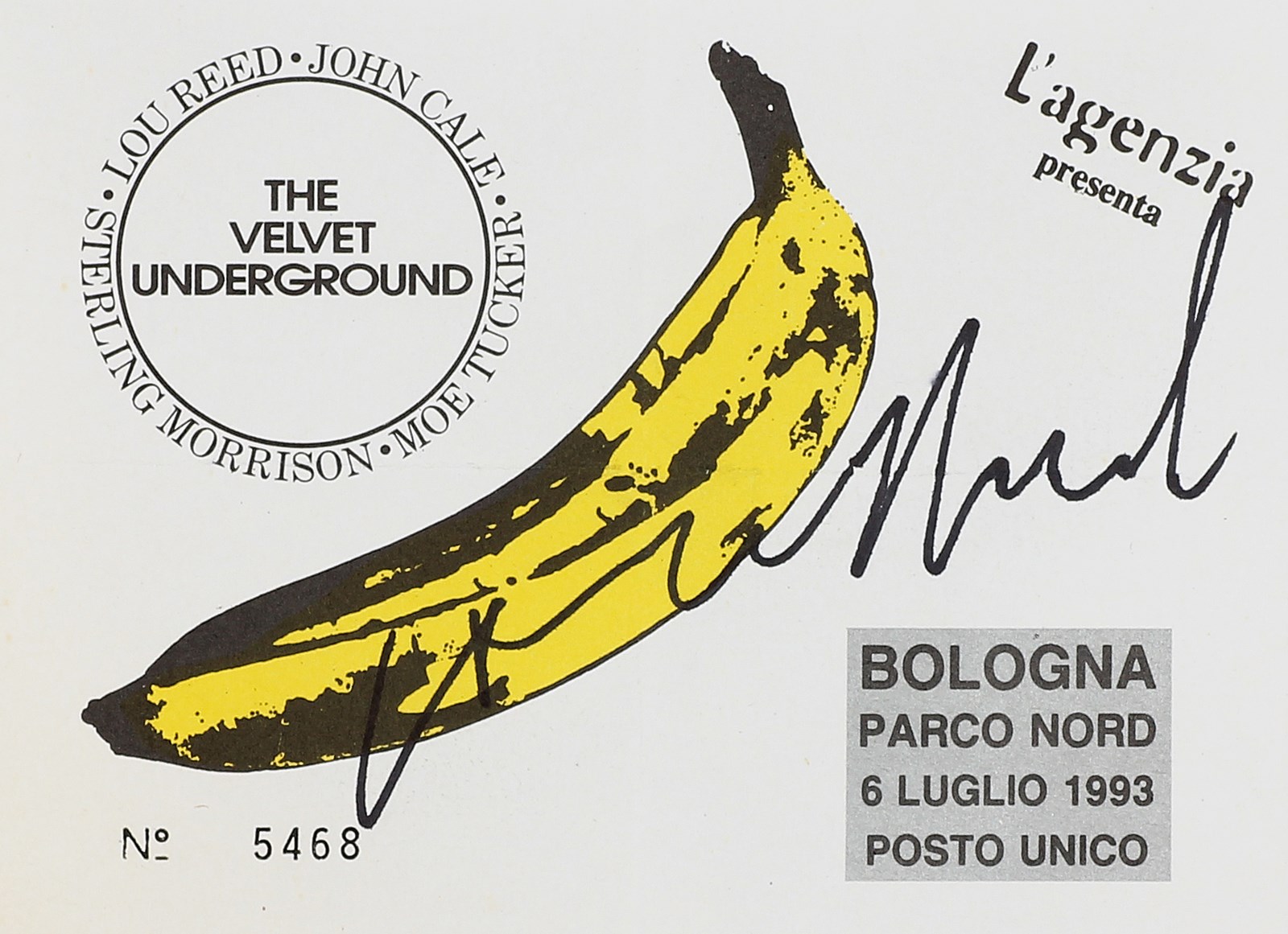 WARHOL ANDY (1928 - 1987) Biglietto del concerto Lou Reed. 1993. Tecnica mista su carta. Cm 12,50 x 9,00. Banana album, The Velvet Underground and Nico. Firmato da Lou Reed.