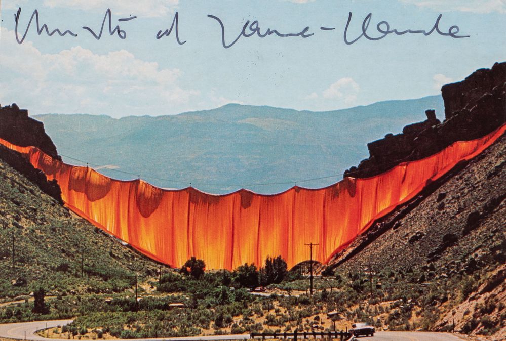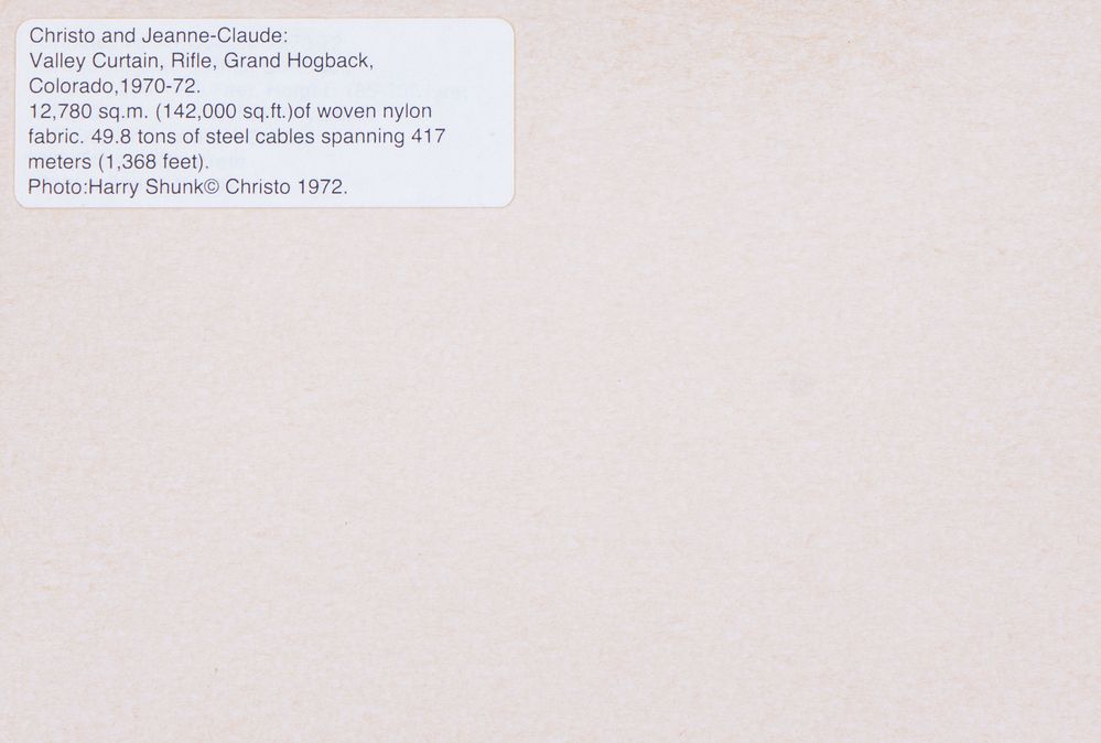 CHRISTO (Gabrovo 1935 - New York 2020) and JEANNE-CLAUDE (Casablanca 1935 - New York 2009) "Valley Curtain, Rifle, Grand Hogback, Colorado", 1972. Cartolina postale. Cm 10x15. Opera firmata in alto Christo and Jeanne-Claude.