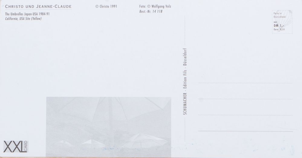CHRISTO (Gabrovo 1935 - New York 2020) and JEANNE-CLAUDE (Casablanca 1935 - New York 2009) "The Umbrellas (Yellow)", 1991. Cartolina postale. Cm 12x23. Opera firmata in basso a sinistra Christo and Jeanne-Claude.