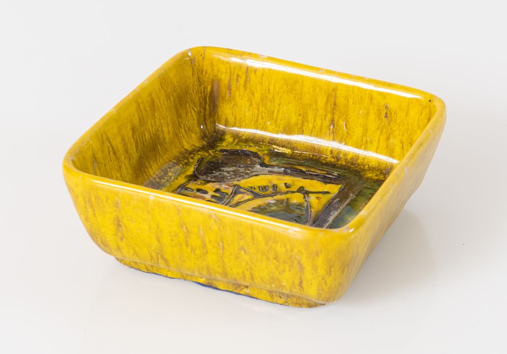 CARLO ZAULI (Faenza 1926 - 2002) Vassoio giallo. Anni '50. Cm 6x15x15. Sotto la base reca firma Capirata Faenza.