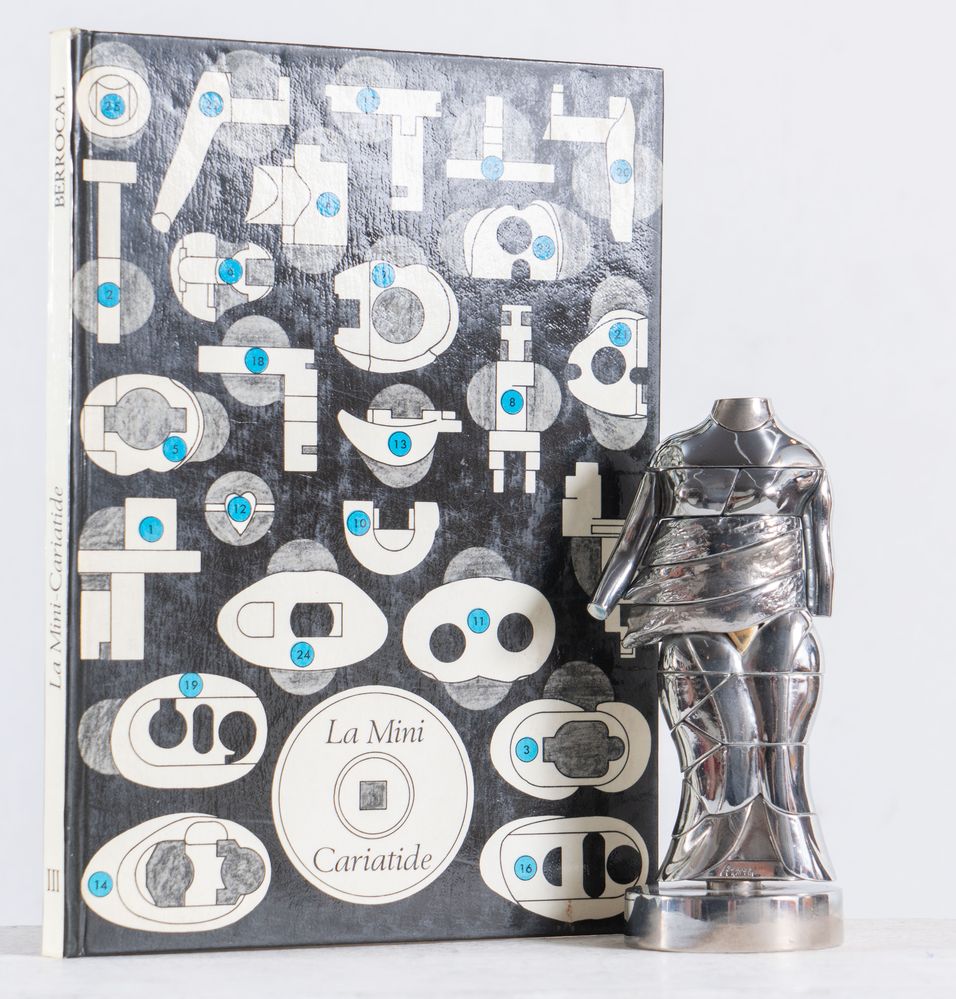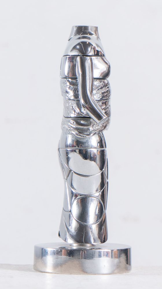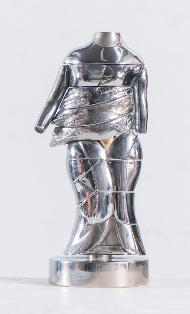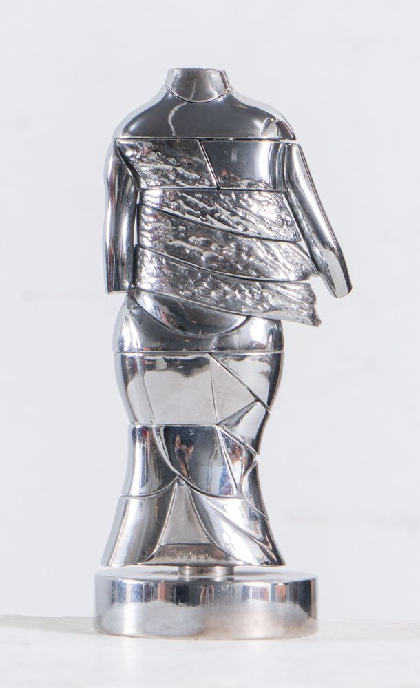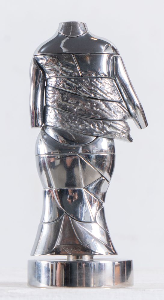 MIGUEL BERROCAL (Villanueva de Algaidas 1933 - Antequera 2006) "Le mini-Cariatide". Scultura multiplo in metallo nichelato. Cm 14x6x5,5. Opera accompagnata da manuale con istruzioni per il montaggio. L'opera reca firma e numero identificativo Berrocal 3250.