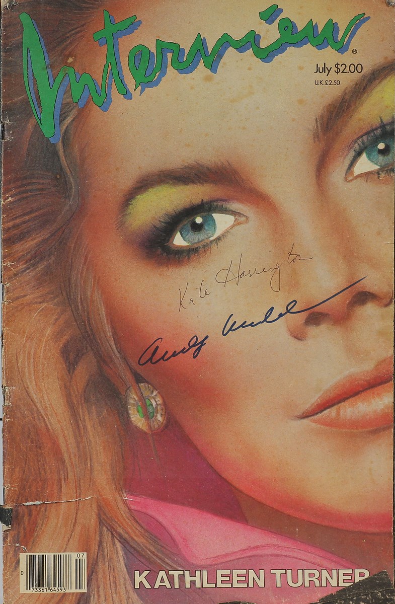 WARHOL ANDY (1928 - 1987) Interview magazine. Intervento su rivista. Cm 27,50 x 43,00 x 1,50. July vol. XIV n.7. Firma Andy Warhol sulla copertina. Copertina lievemente usurata al fronte ed al retro.
