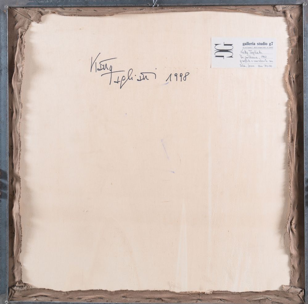 KETTY TAGLIATTI (Ferrara 1955) "In poltrona", 1998. Grafite e mordente su tela e ferro. Cm 70x70. Al retro opera firmata e datata Ketty Tagliatti 1998. Al retro reca etichetta della Galleria Studio G7, Bologna.