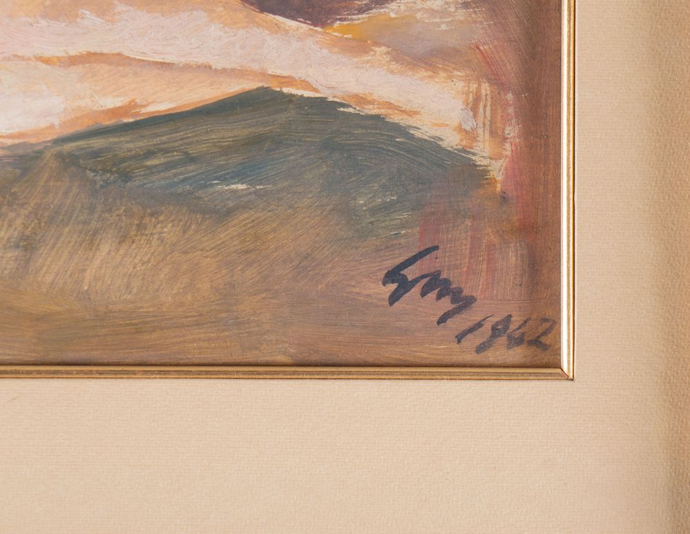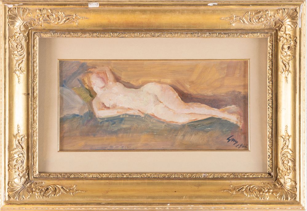 GINO MARZOCCHI (Molinella 1895 – Bologna 1981) "Nudo disteso", 1942. Olio su faesite. Cm 20x41. Opera siglata e datata in basso a destra GM 1942. Al retro opera firmata Gino Marzocchi.