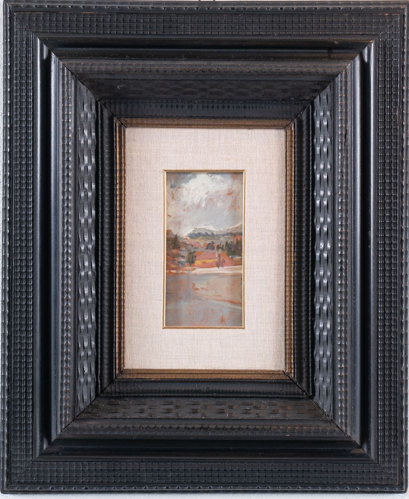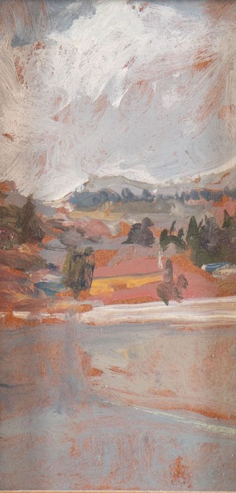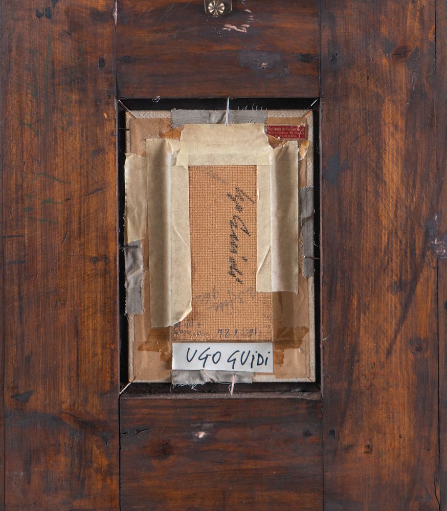 UGO GUIDI (Comacchio 1923 - Bologna 2007) "Paesaggio". Olio su faesite. Cm 16,3x8,8. Al retro opera firmata Ugo Guidi.