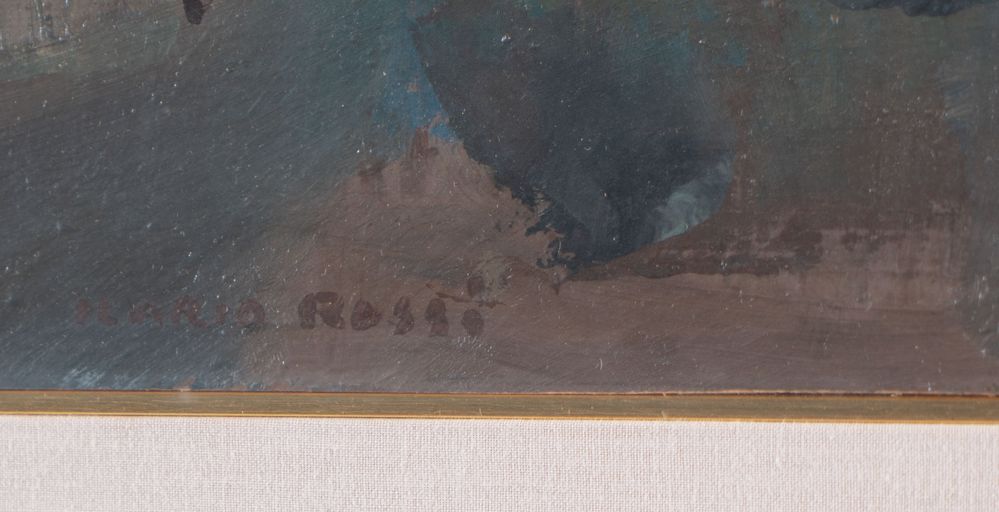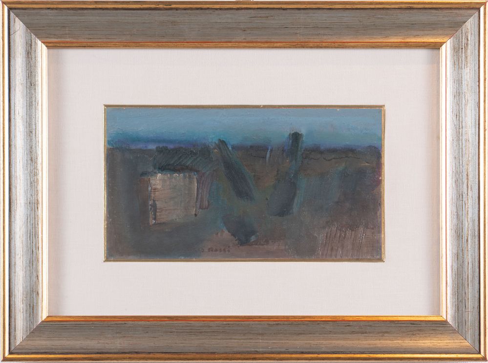 ILARIO ROSSI (Bologna 1911 - 1994) "Pianura all'imbrunire", 1960. Olio su tavola. Cm 16,5x30,5. Al retro opera firmata, intitolata e datata Ilario Rossi, Pianura all'imbrunire, 1960. Al retro reca dedica a firma Ilario Rossi.