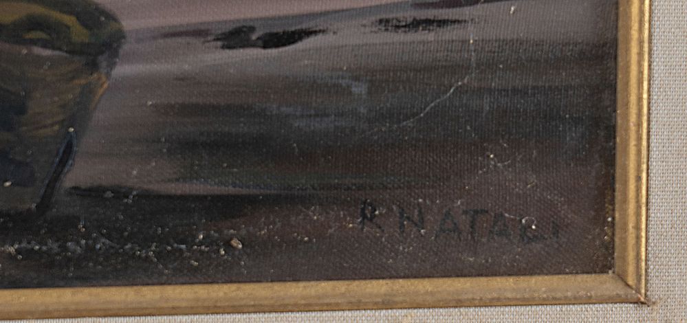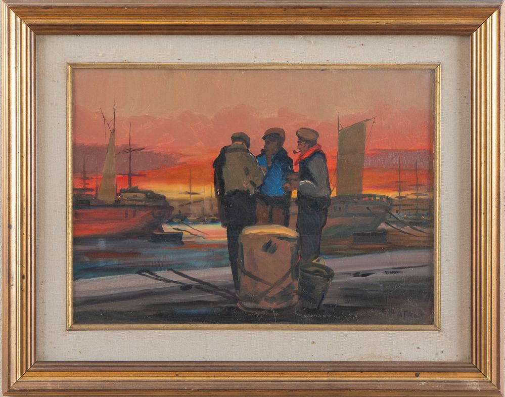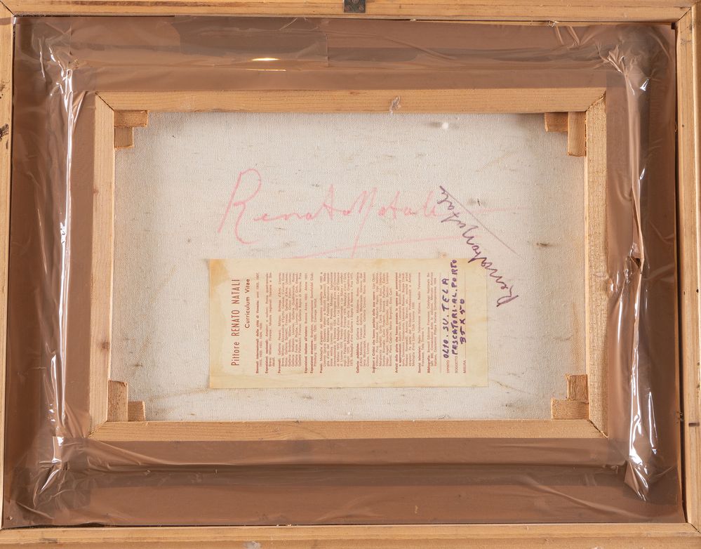 RENATO NATALI (Livorno 1883 - 1979) "Pescatori al porto". Olio su tela. Cm 35x50. Opera firmata in basso a destra R. Natali. Al retro reca etichetta con firma del pittore.