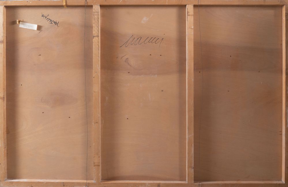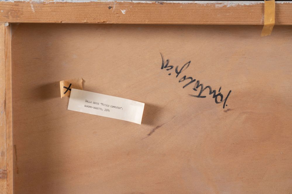 MARIO NANNI (Castellina in Chianti 1922) "Senza titolo", dalla serie Mitico Computer, 1974. Olio, tecnica mista e collage su tavola. Cm 125x192. Al retro opera firmata Nanni.