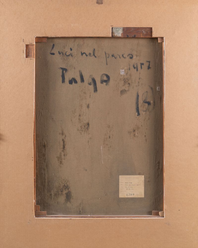 BRUNO PULGA (Bologna 1922 - 1992) "Luci nel parco", 1957. Olio su tela. Cm 80x60. Opera datata, intitolata e firmata Luci nel parco, 1957, Pulga. Al retro reca etichetta della Galleria d'Arte Il Milione, Milano. Al retro reca etichetta della Galleria Odissya, Roma. Pubblicazioni: a cura di Marco Valsecchi, Pulga, Giov. Pittura italiana, Edizioni del Milione, Milano, pag. 13.