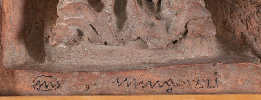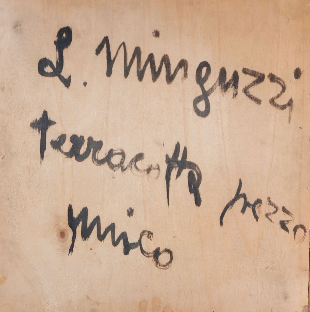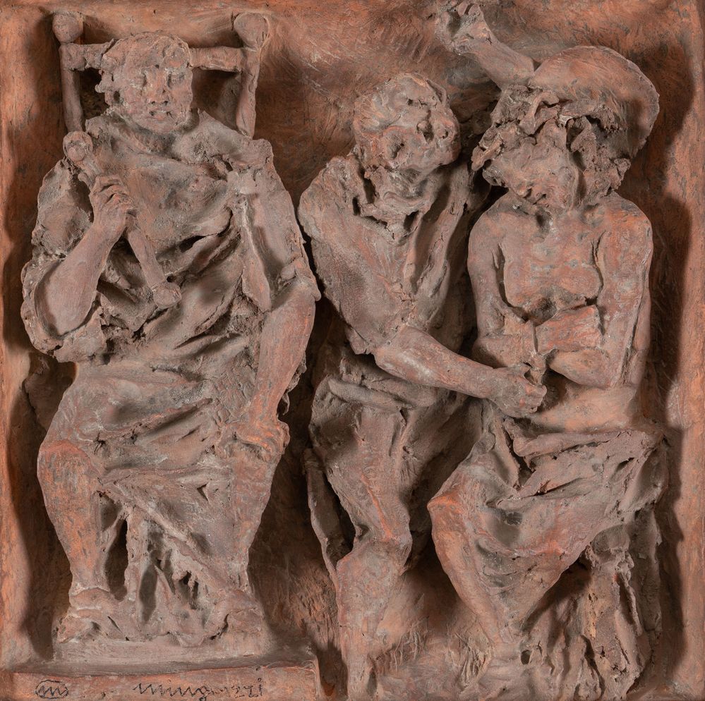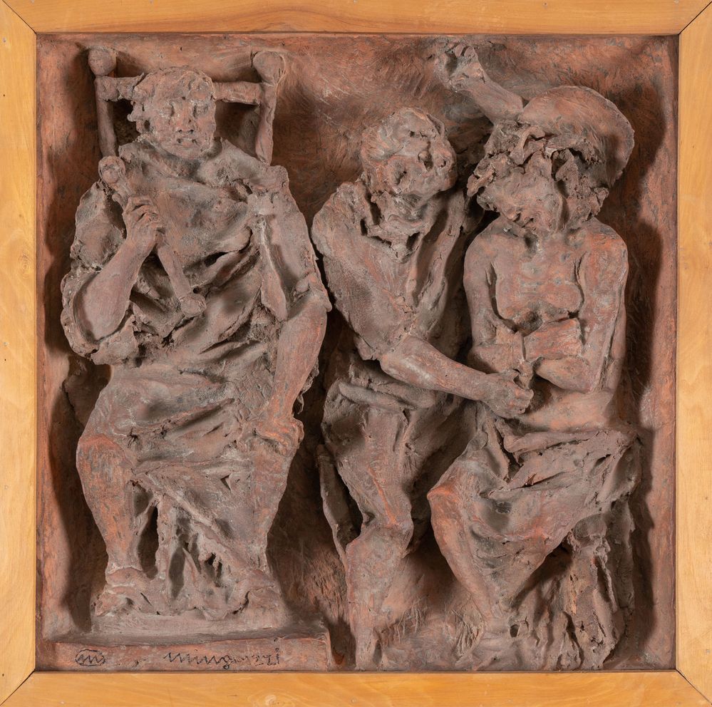 LUCIANO MINGUZZI (Bologna 1911 - Milano 2004) "Cristo condannato a morte". Altorilievo in terracotta. Cm 51x51. Opera siglata e firmata in basso a sinistra M e Minguzzi. Al retro opera firmata L. Minguzzi. Esemplare unico.