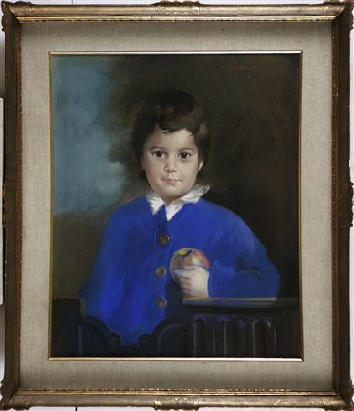 FAVERO LORENZO (1911 - 1974) Ritratto di bambino. 1957. Tecnica mista su carta. Cm 50,00 x 60,00. Firma e data in alto a sinistra. Al retro cartiglio descrittivo dell'opera a cura di Travelling Art Gallery (Salò) e informazioni riguardanti l'artista con bibliografia. Cornice presente