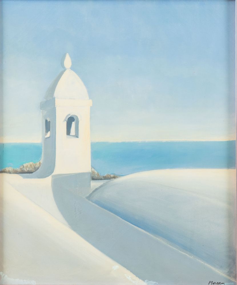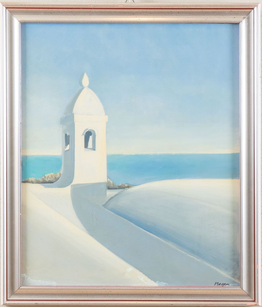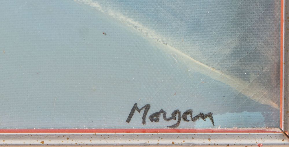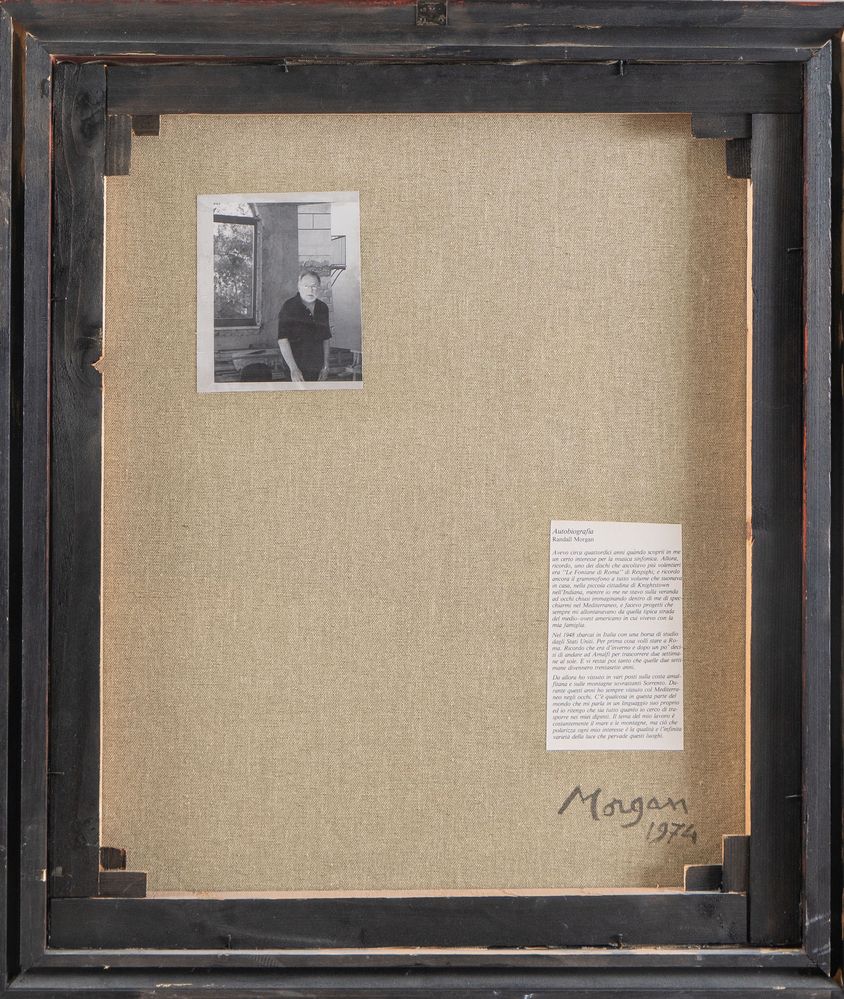 RANDALL MORGAN (Knightstown 1920 - Sorrento 1994) "Veduta marina", 1974. Acrilico su tela. Cm 60x50,5. Opera firmata in basso a destra Morgan. Al retro opera firmata e datata Morgan 1974.