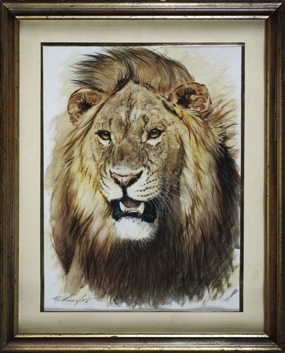 ANONIMO Leone. 1985. Tecnica mista su carta. Cm 35,00 x 45,00. Firma illeggibile e data in basso a sinistra a matita. Cornice presente