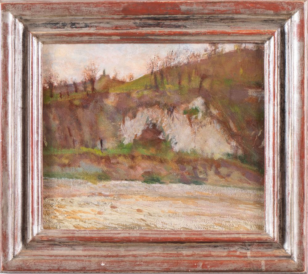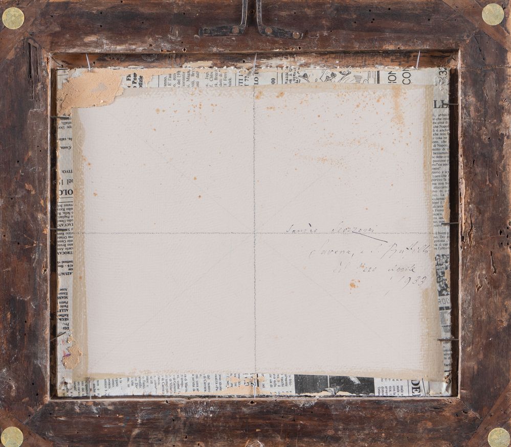 ALESSANDRO SCORZONI (Calcara di Crespellano 1858 – Bologna 1933) "Savena a S. Ruffillo dal vero",1933. Olio su faesite. Cm 27,5x33. Al retro opera firmata, intitolata e datata Sandro Scorzoni, Savena a S. Rufillo dal vero, 1933.