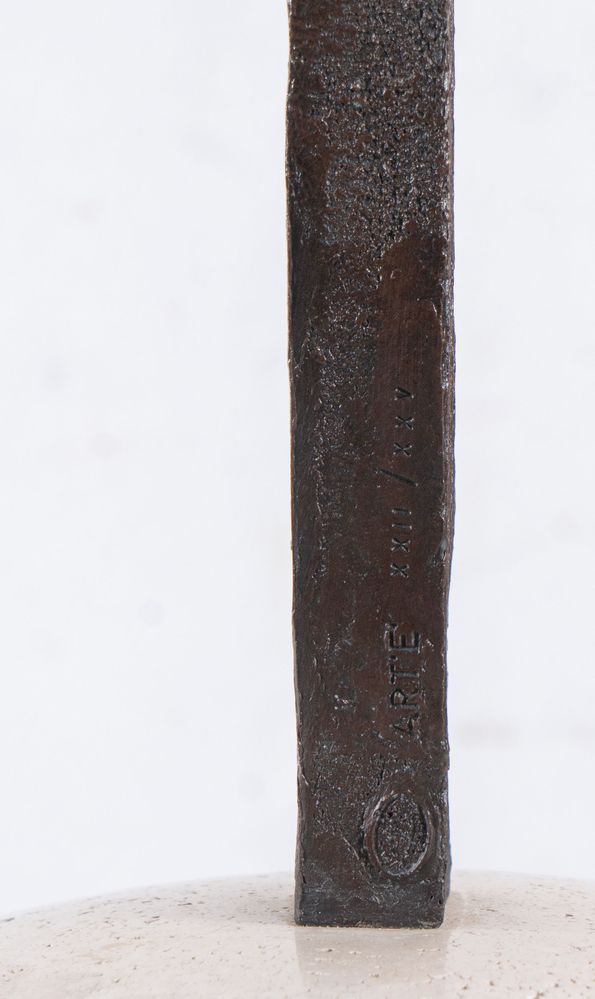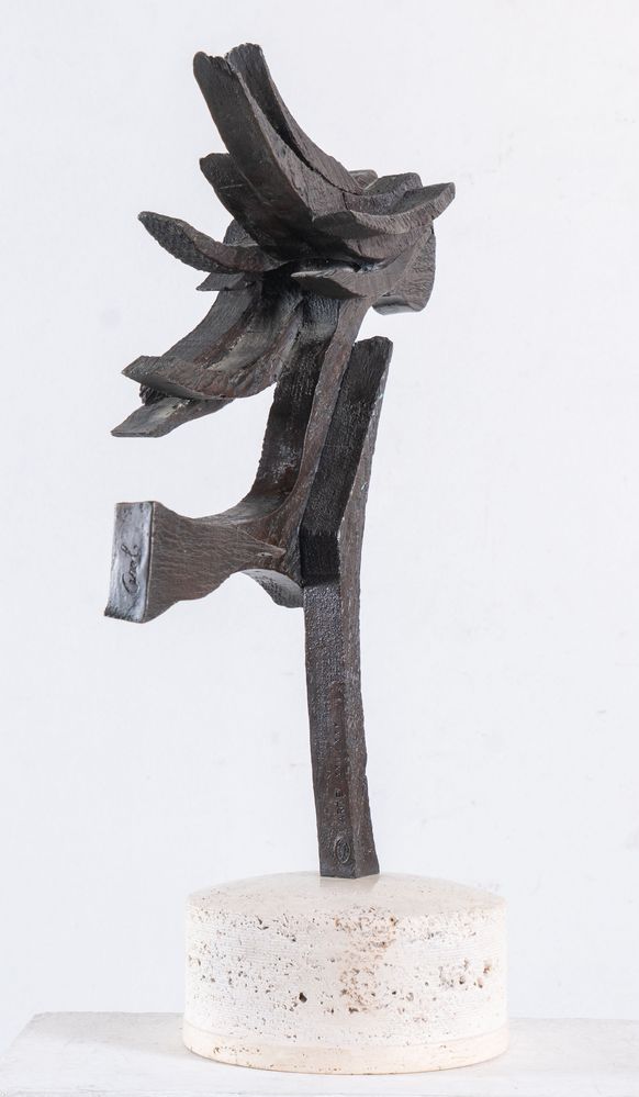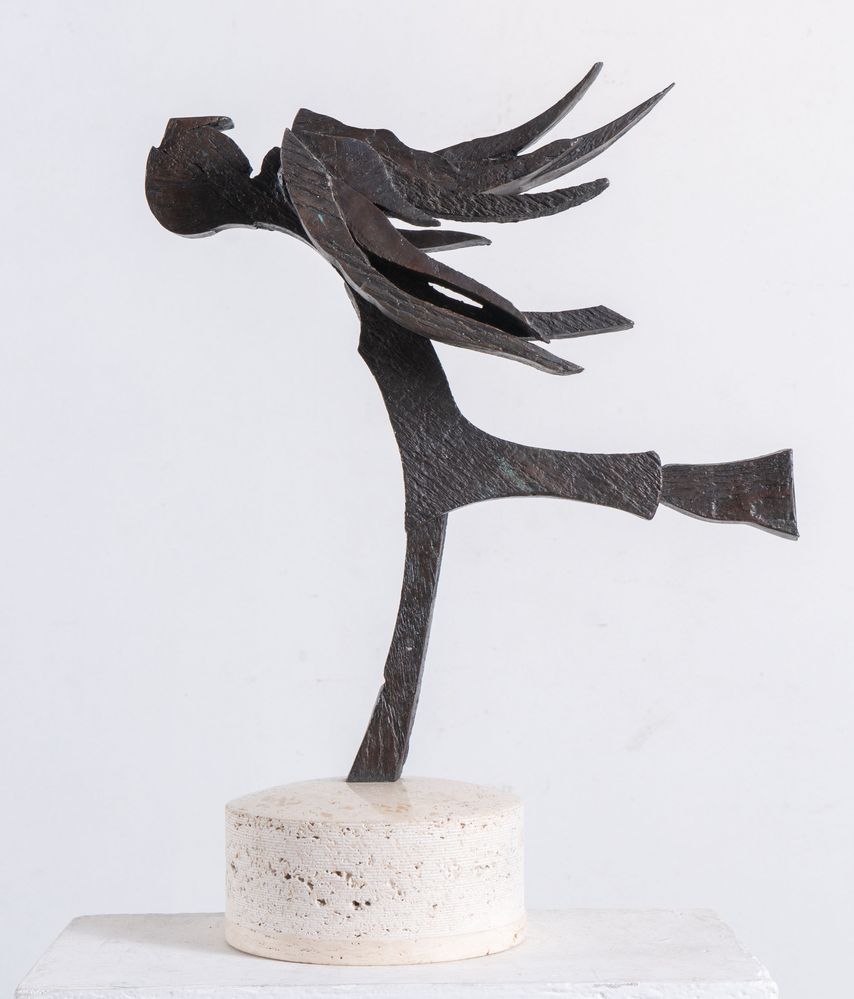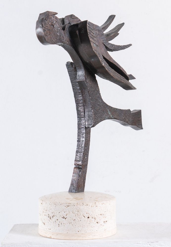 MARIO CEROLI (Castel Frentano 1938) "L'angelo", 2000. Scultura in bronzo su basamento in travertino. Cm 43x37x12,5. Opera firmata a lato Ceroli. Opera reca sigilli della Fonderia Venturi Arte e Art'è. L'opera reca numeri di tiratura XX/XXV. Opera realizzata in occasione del Giubilero del 2000, con il procedimento di fusione a cera persa dalla fonderia Venturi Arte con rifinitura a cesello e patinatura con acidi a toni sfumati eseguita a mano. La tiratura è limitata a centocinquanta esemplari numerati su 150 e venticinque esemplari numerati su XXV.
