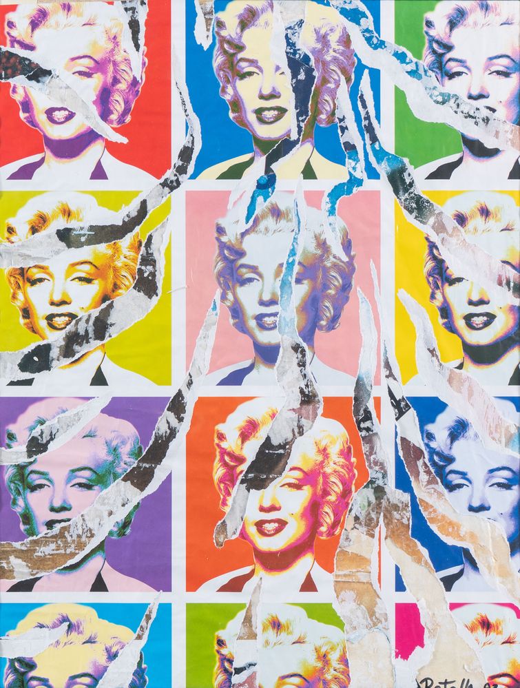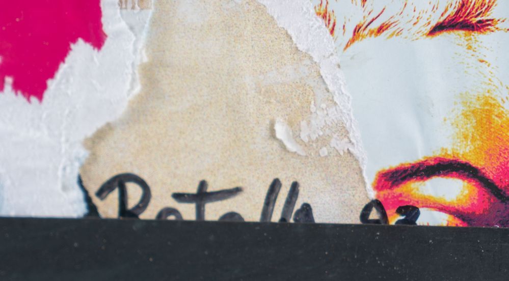 MIMMO ROTELLA (Catanzaro 1918 - Milano 2006) "Marilyn", 1993. Décollage su carta. Cm 71x52. Opera firmata e datata in basso a destra Rotella '93. Al retro opera firmata e intitolata Rotella Marilyn. Opera accompagnata da autentica su fotografia con timbro della Fondazione Mimmo Rotella, con numero d'archivio 1122 DC 993/00.