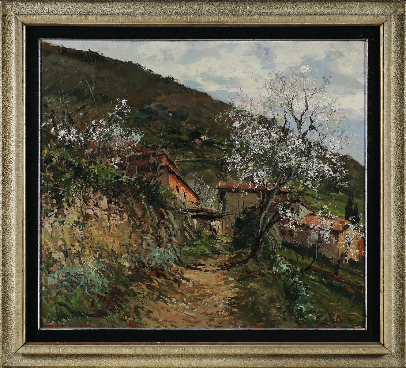 VERNI ARTURO (1891 - 1960) Veduta di paesaggio montano. Olio su cartone pressato. Cm 65,00 x 72,00. Firma in basso a destra. Al retro firma per autentica della figlia dell'artista. Cornice presente