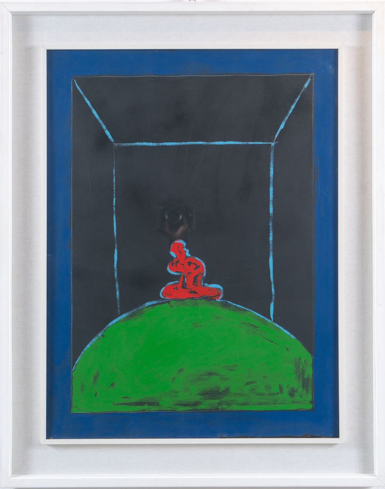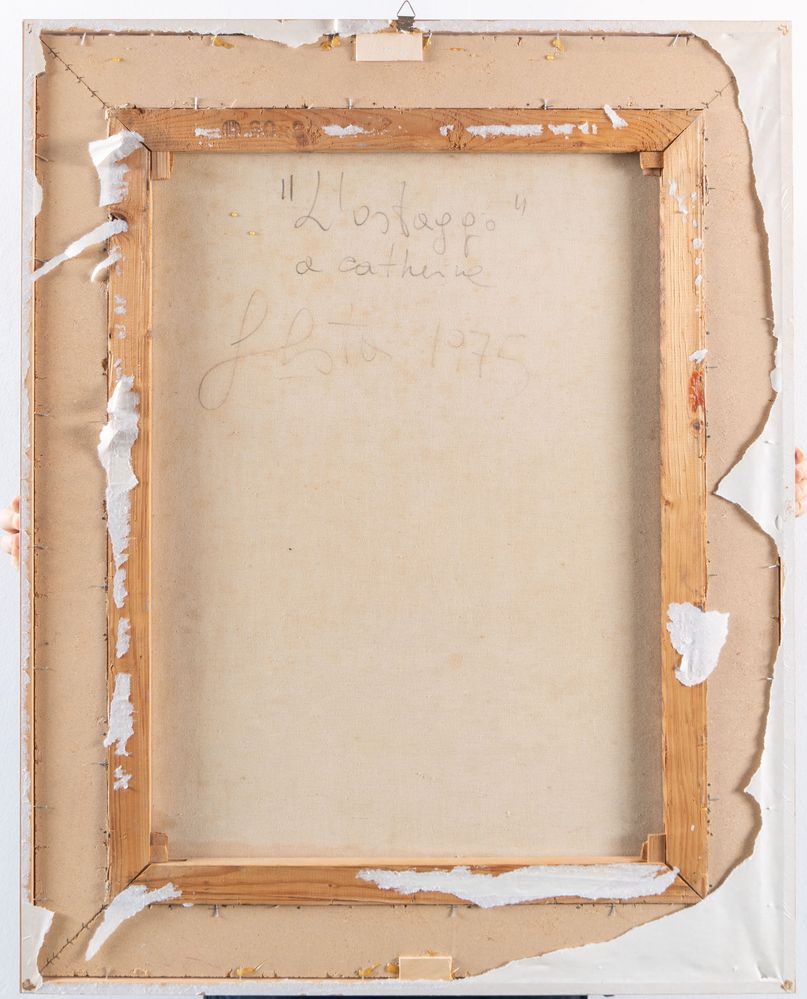 TANO FESTA (Roma 1938 - 1988) "L'ostaggio", 1975. Smalto e acrilico su tela. Cm 80x60. Al retro opera intitolata, firmata e datata L'ostaggio, Festa, 1975. Al retro reca dedica. Opera accompagnata da autentica su fotografia dell'Archivio Tano Festa con numero di riferimento RMS75800022 con timbro Archivio Tano Festa - Studio Soligo. Provenienza: importante collezione privata.