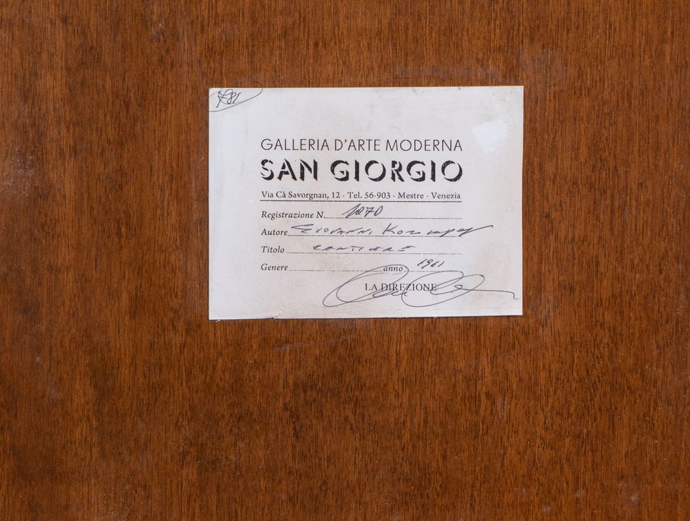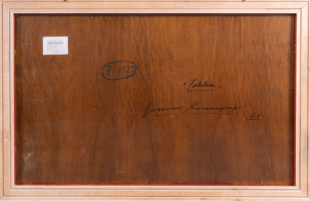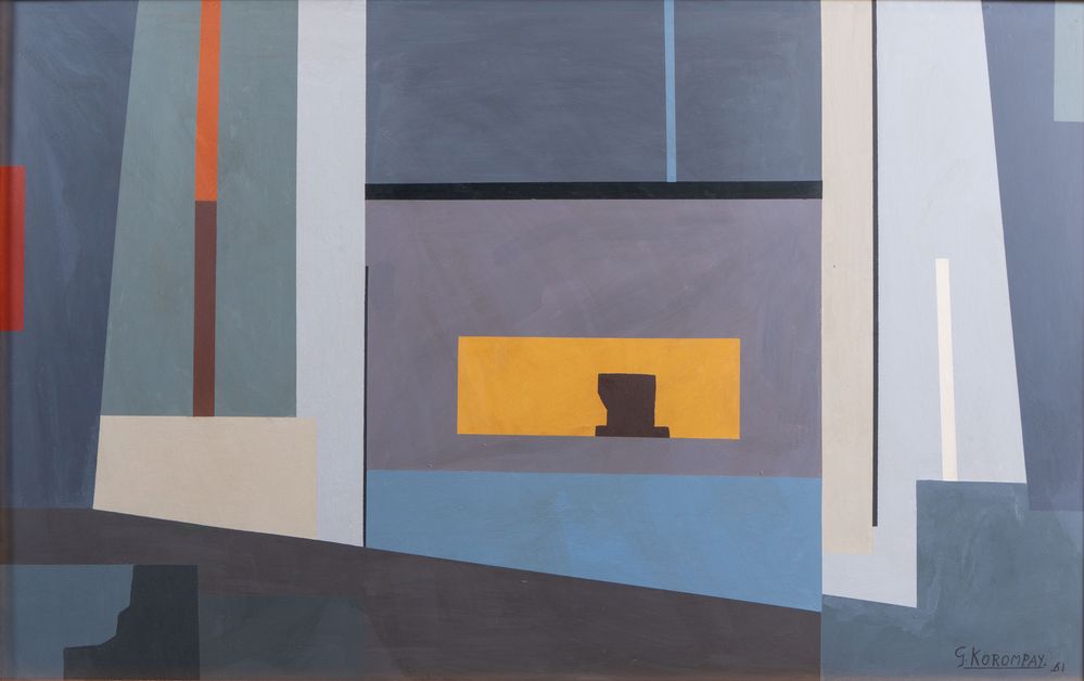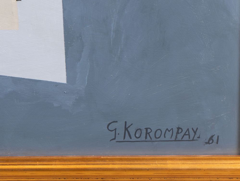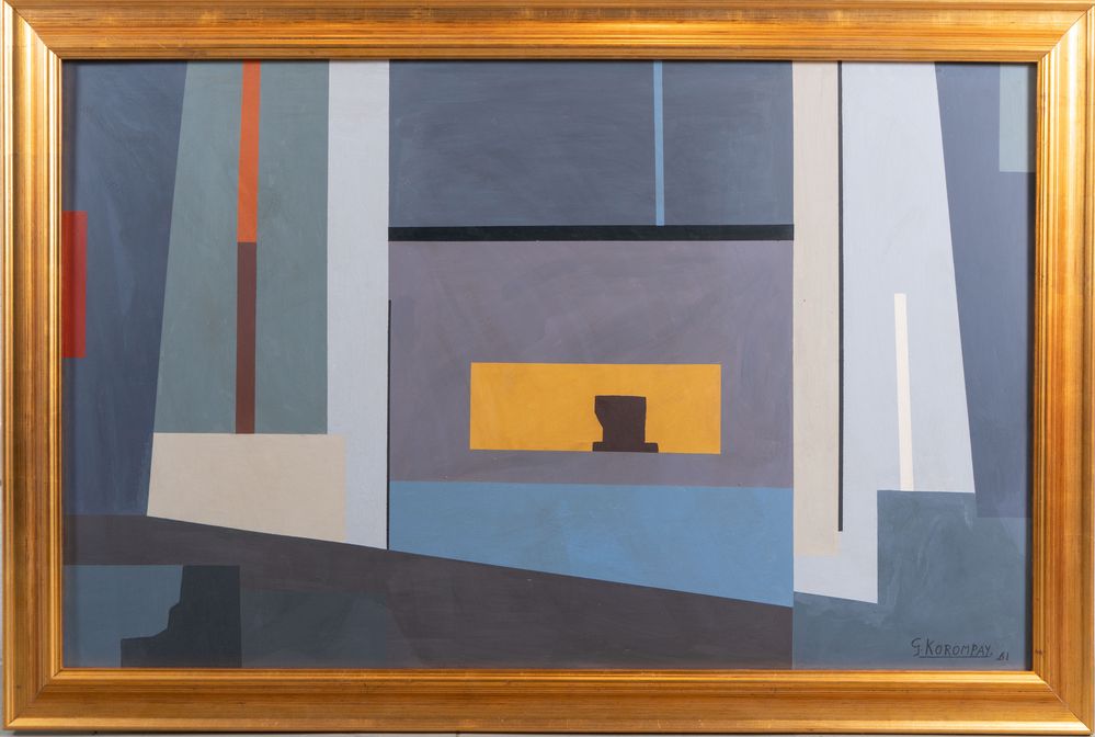 GIOVANNI KOROMPAY (Venezia 1904 - Rovereto 1988) "Fabbrica", 1961. Olio su tavola. Cm 77x122. Opera firmata e datata in basso a destra G. Korompay 61. Al retro opera intitolata, firmata e datata Fabbrica, Giovanni Korompay, 61. Al retro reca etichetta della Galleria d'arte moderna San Giorgio, Mestre. Opera accompagnata da autentica su fotografia.