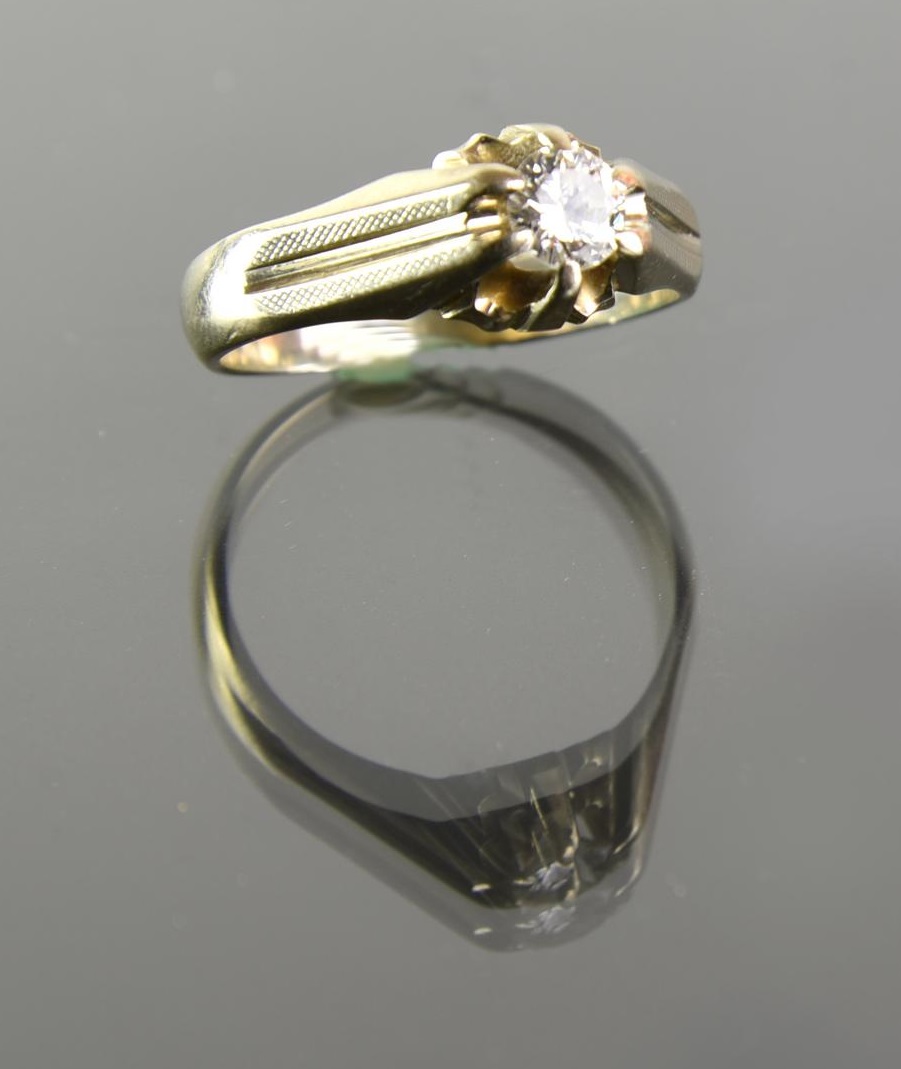 al centro della fascia scanalata e incisa e' montato un diamante taglio brillante rotondo di ct 0.62, colore I-J, purezza VS, entro castone sagomato e traforato, punzone 750, peso complessivo gr. 7,40, misura 25
