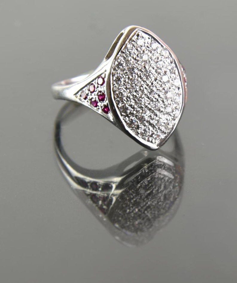in oro bianco 18kt, modellato a navette con al centro pave' di piccoli diamanti e, ai lati, 6 rubini per ciascuno. Peso complessivo gr. 5,95, misura 17