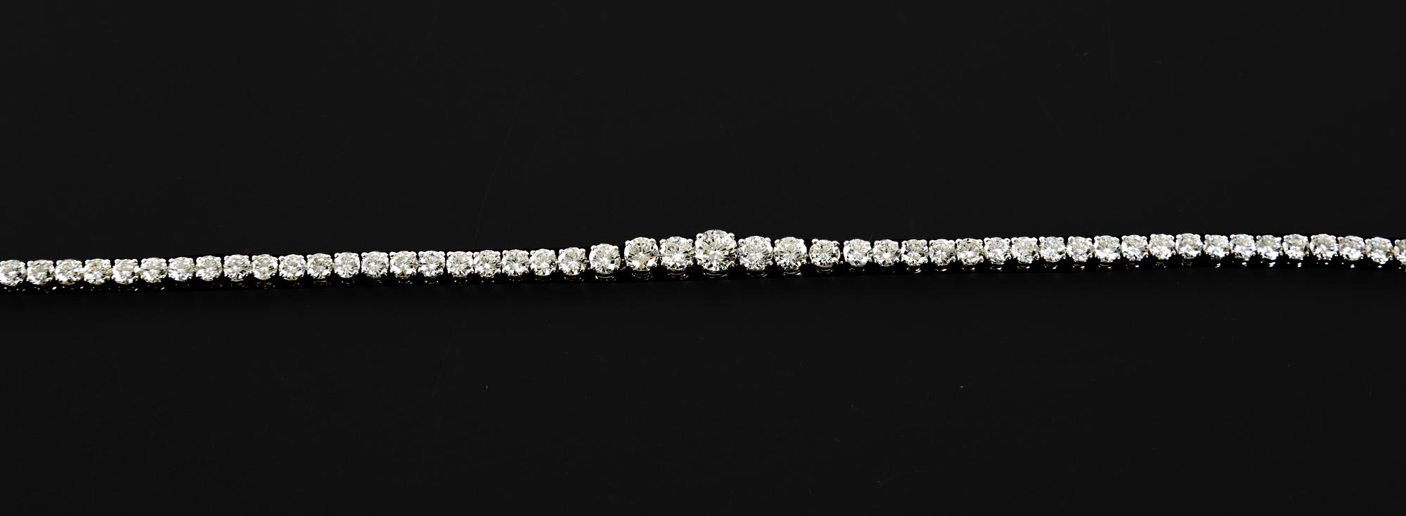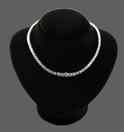 in oro bianco 18kt, ad una fila di 93 diamanti rotondi taglio brillante, in degrade', per complessivi ct 25,55 circa. Diamante centrale di 1,16 ct circa. Grado medio di colore G, grado medio di purezza VS. Peso complessivo gr. 41,3, lunghezza cm 39