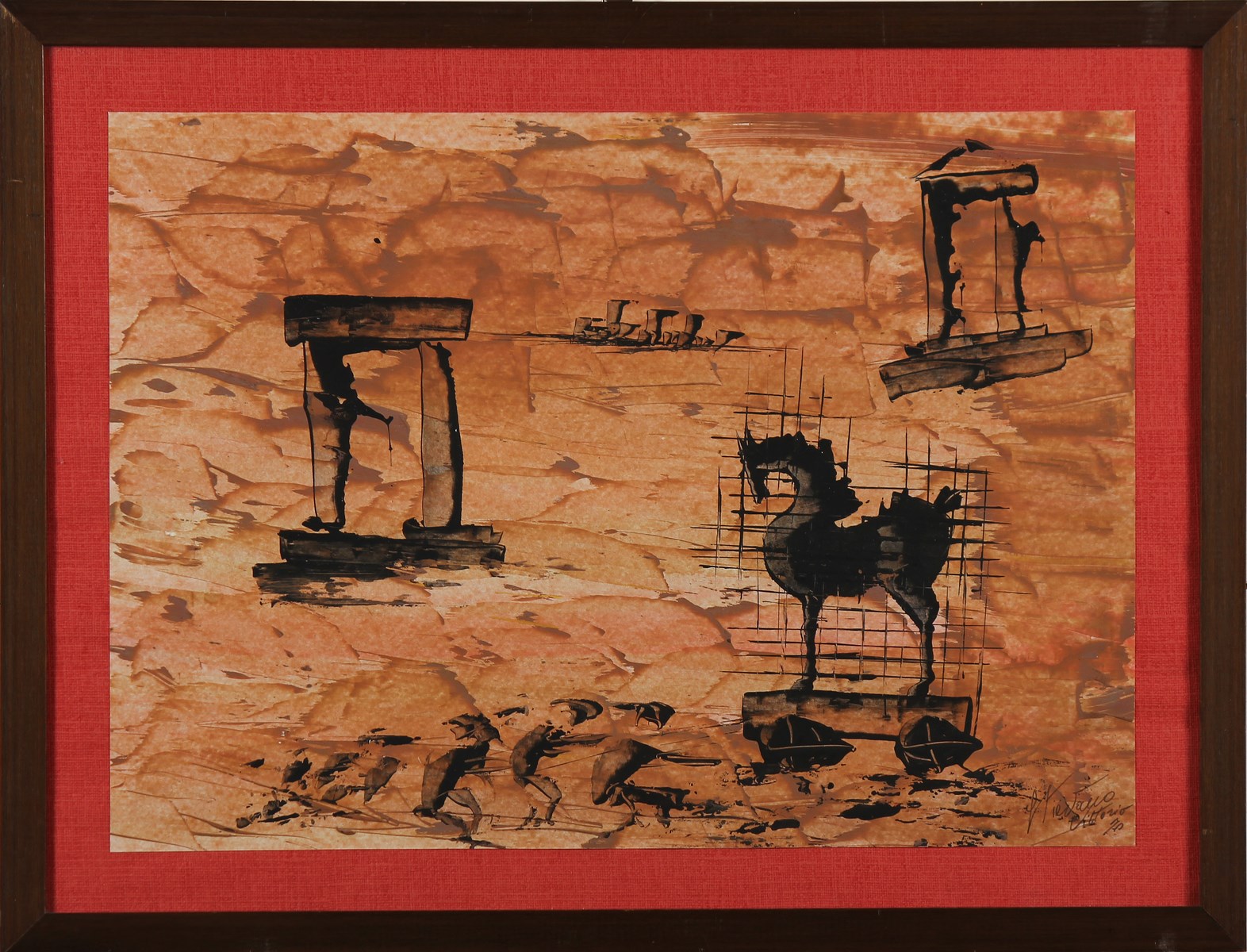 VIESTANO VITTORIO Senza titolo. 1970. Tecnica mista su carta. Cm 56,50 x 40,50. Firma e data in basso a destra. Al retro cartiglio descrittivo dell'opera. Cornice presente