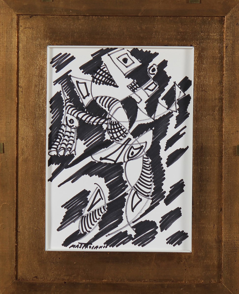 MASTROIANNI UMBERTO (1910 - 1998) Studio per l'uccello di fuoco. Pennarelli su carta. Cm 25,00 x 35,00. Firma in basso a sinistra. Al retro reca il cartiglio di Adriano Villalta Mercante d'Arte, Cerrino Monferrato. Autentica dell'artista su fotografia. Cornice presente