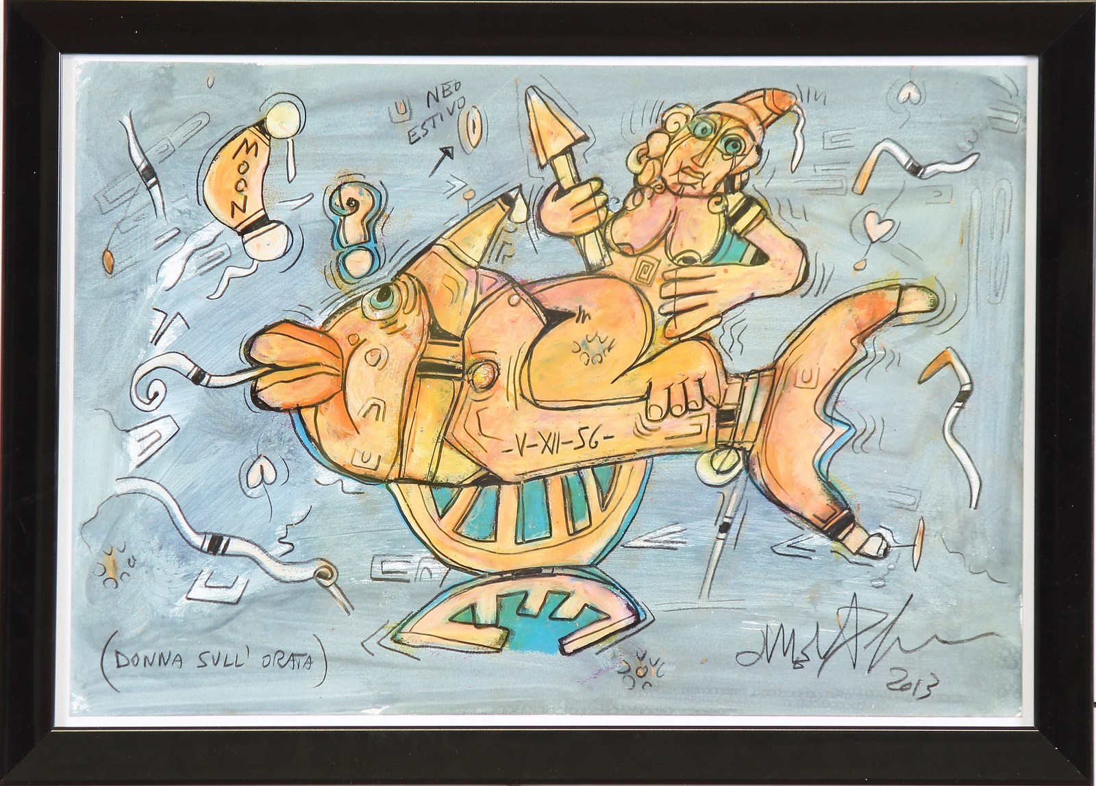 DELEGO MARTINO (n. 1956) Donna sull'orata. 2013. Tecnica mista su cartoncino. Cm 47,00 x 33,00. Firma, titolo e data in basso. Autentica dell'artista su fotografia. Cornice presente