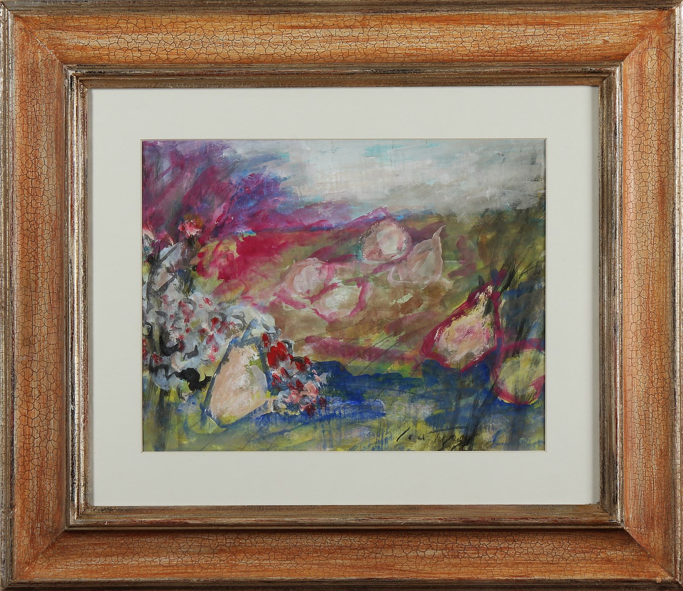 SCATIZZI SERGIO (1918 - 2009) Senza titolo. Olio su carta. Cm 47,00 x 37,00. Firma in basso a destra. Al retro firma. Autentica dell'artista su fotografia. Cornice presente