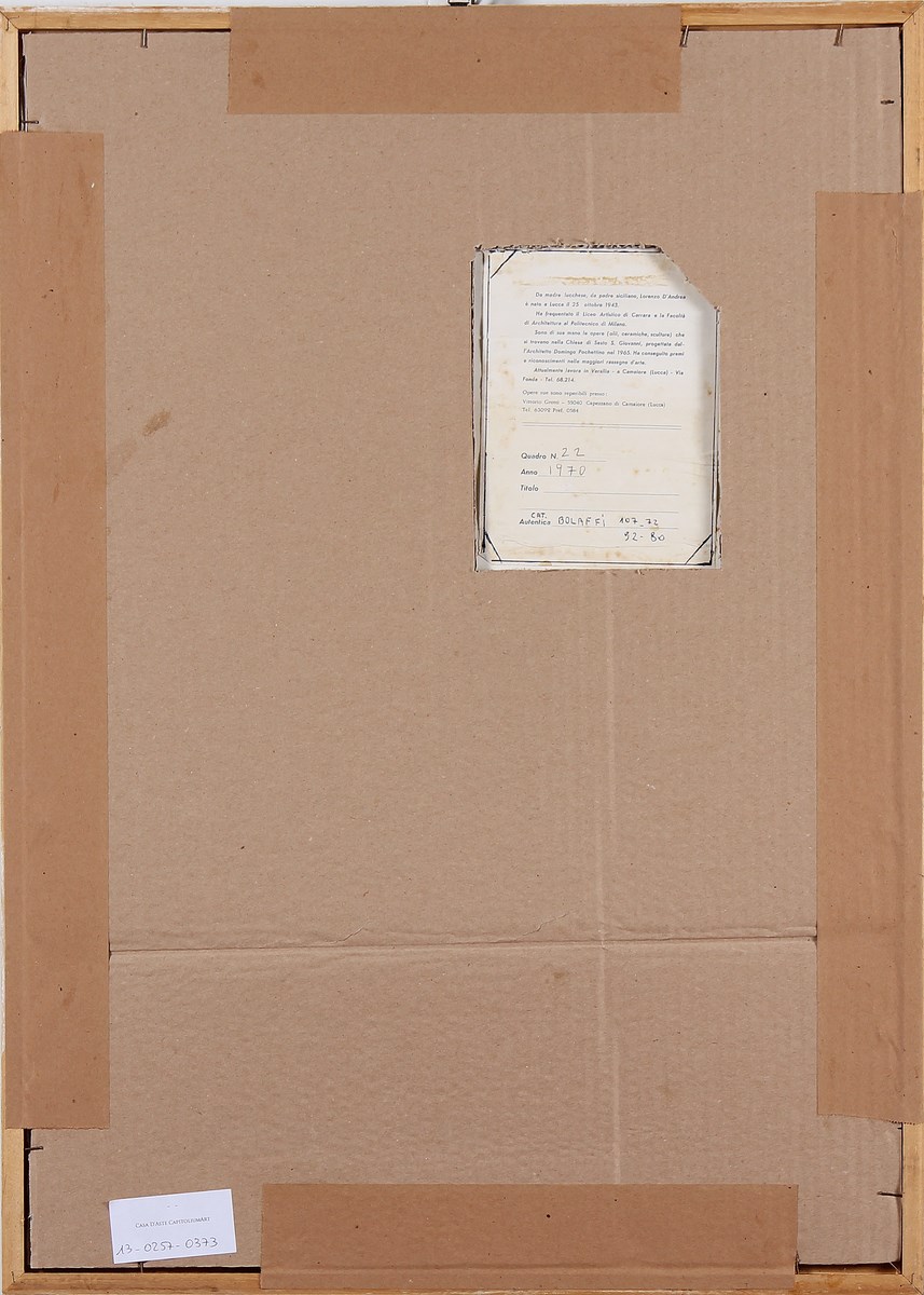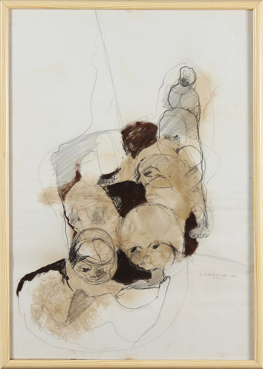 D'ANDREA LORENZO (n. 1943) Senza titolo. 1970. Tecnica mista su carta. Cm 50,00 x 70,00. Firma e data in basso a destra a matita. Al retro cartiglio descrittivo della vita dell'artista. Cornice presente