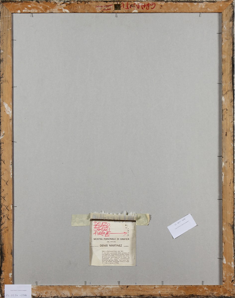 MARTINEZ DENIS (n. 1941) Puisque le mot est une prison. 1968. Tecnica mista su carta. Cm 50,00 x 65,00. Firma e anno in basso a sinistra. Al retro reca il cartiglio della mostra personale di grafica tenuta presso Palazzo Strozzi, Firenze nel 1970. Cornice presente