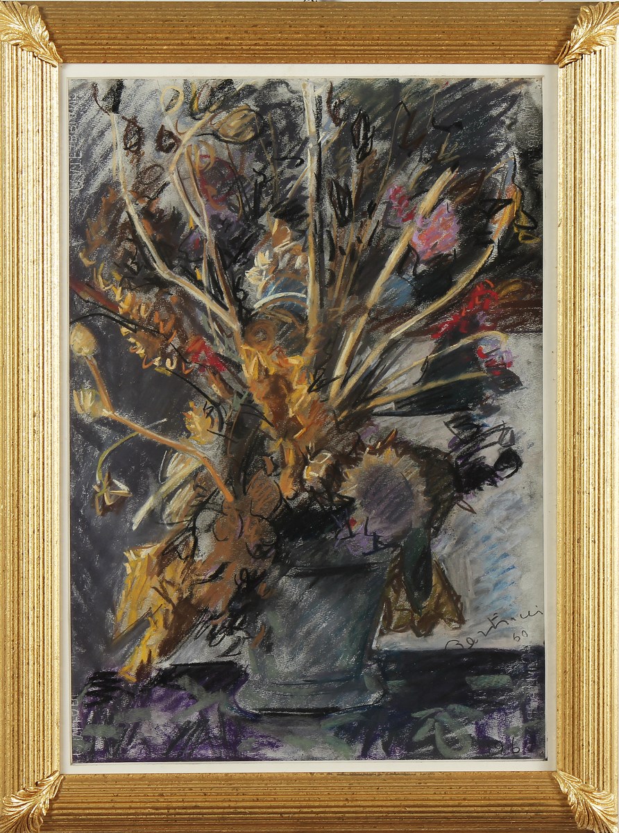 BERTELLI BONA Vaso di fiori. 1960. Tecnica mista su carta. Cm 46,00 x 66,00. Firma e data in basso a destra. Al retro disegno a carboncino. Cornice presente