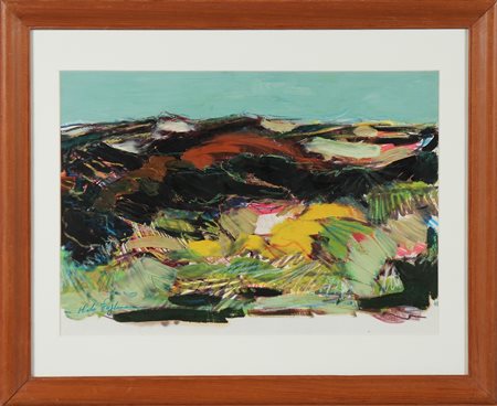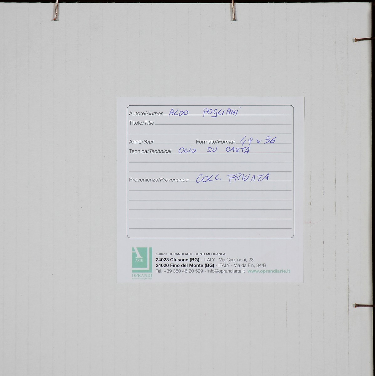 POGLIANI ALDO (1936 - 2008) Senza titolo. Olio su carta. Cm 36,00 x 49,00. Firma in basso a sinistra. Al retro cartiglio descrittivo della Galleria Oprandi Arte Contemporanea, Fino del Monte (BG). Cornice presente