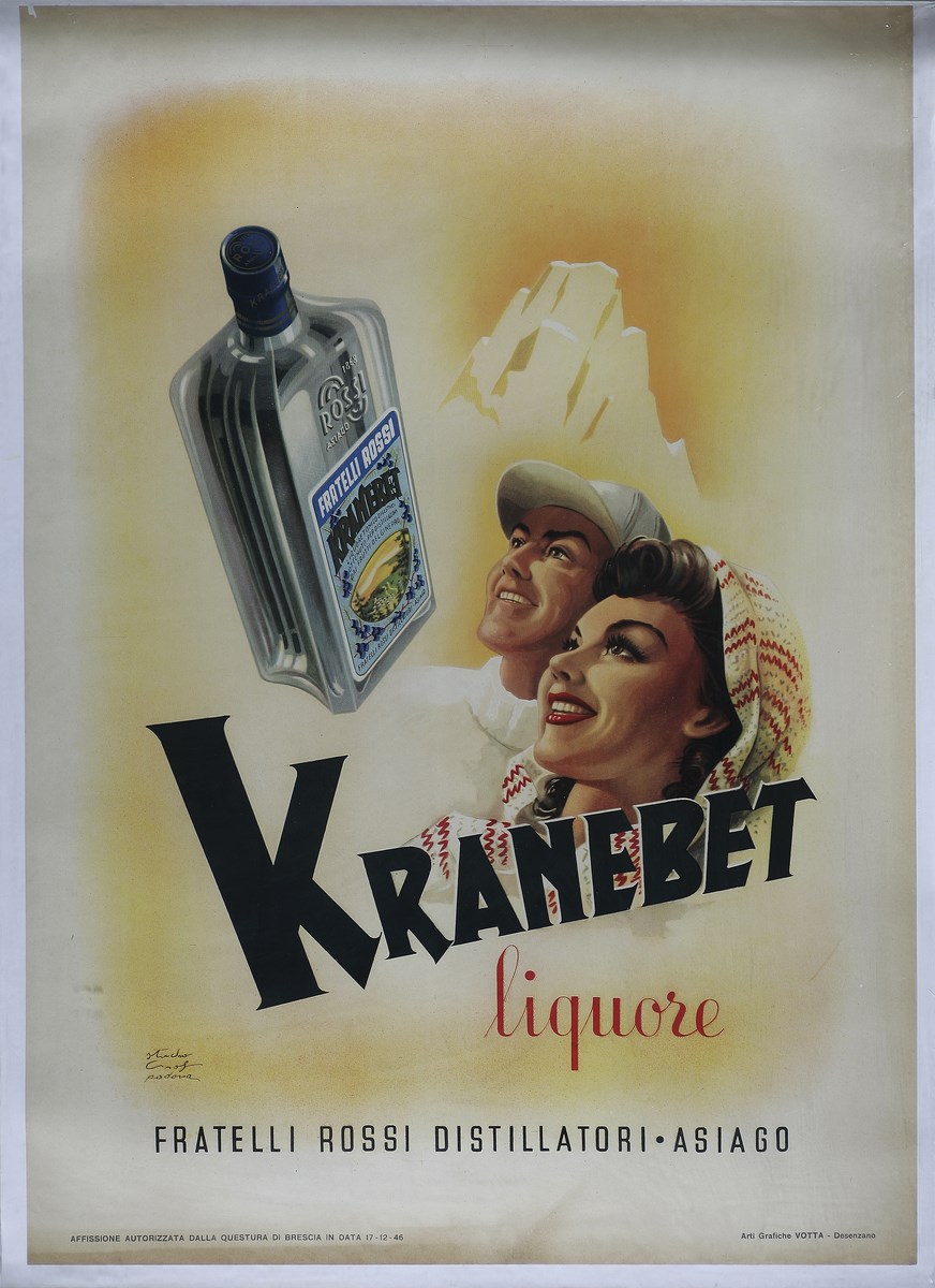 ANONIMO Kranebet liquore, Fratelli Rossi distillatori - Asiago. Manifesto intelato. Cm 75,00 x 109,00. Arti grafiche Dotta, Desenzano. Affissione autorizzata dalla Questura di Brescia in data 17-12-46.