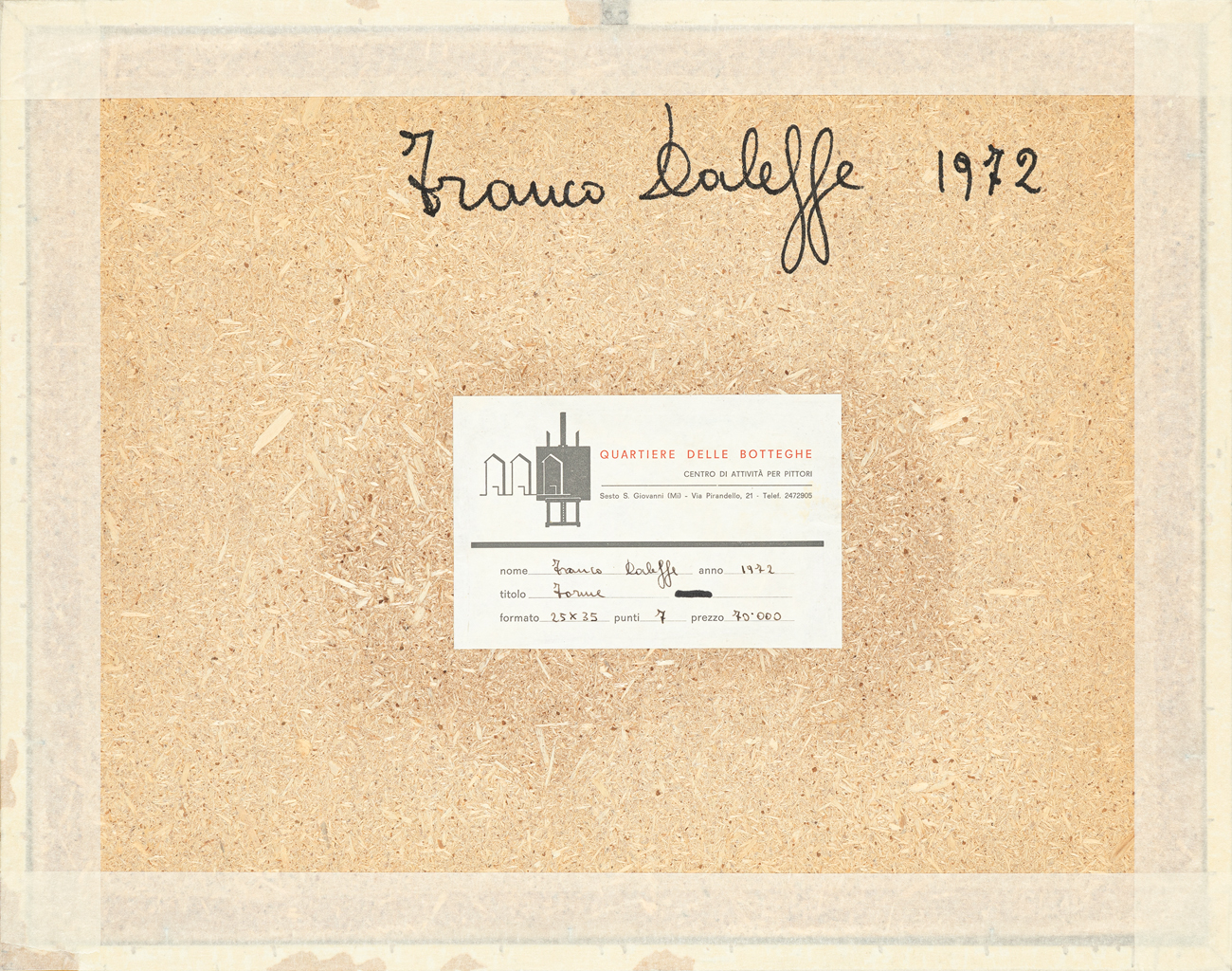 Etichetta della Galleria Quartiere delle Botteghe (Mi) al retro