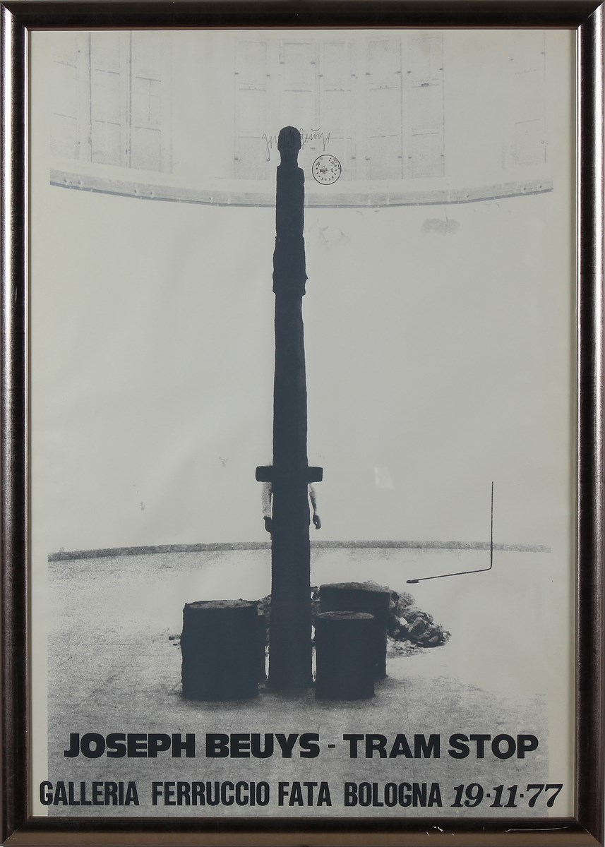 BEUYS JOSEPH (1921 - 1986) Joseph Beuys - Tram Stop. Manifesto. Cm 70,00 x 100,00. Manifesto della Mostra "Tram Stop" tenutasi presso la Galleria Ferruccio Fata, Bologna il 19-11-77. Firma in alto a matita. Cornice presente