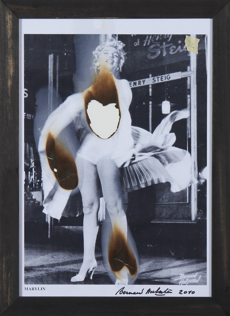 AUBERTIN BERNARD (n. 1934) Marylin. 2010. Poster bruciato. Cm 35,00 x 50,00. Firma e data in basso a destra. Autentica dell'artista su fotografia. Cornice presente