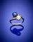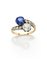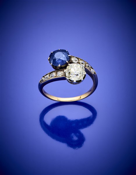 Anello a contrarié in oro e argento con diamante a cuscino di ct. 1,30 circa e uno zaffiro rotondo di ct. 1,70 circa, rifinito con diamanti più piccoli, g 4,68 circa misura 16/56.