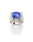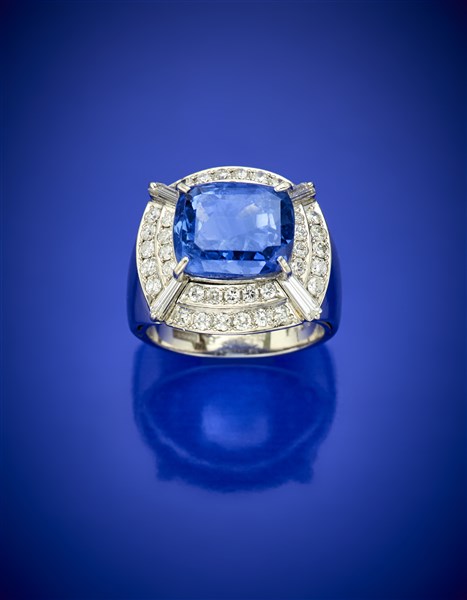 Anello in platino e diamanti per complessivi ct. 0,80 circa con zaffiro centrale a cuscino di ct. 5,80 circa, g 14,64 circa misura 11/51.