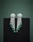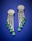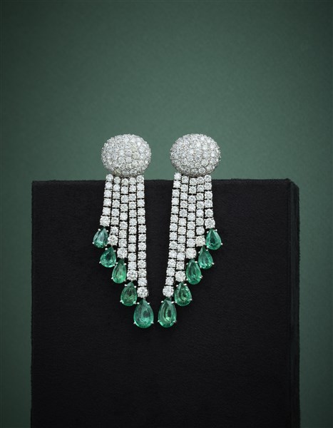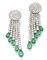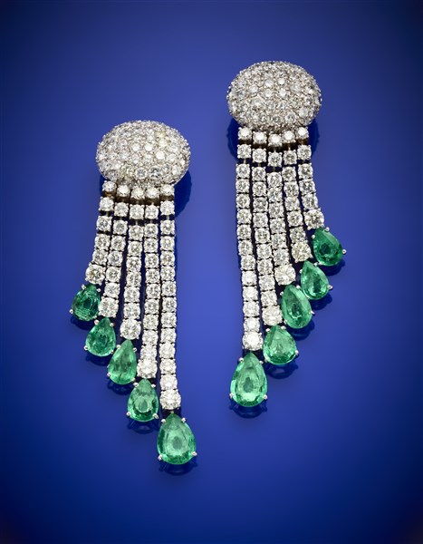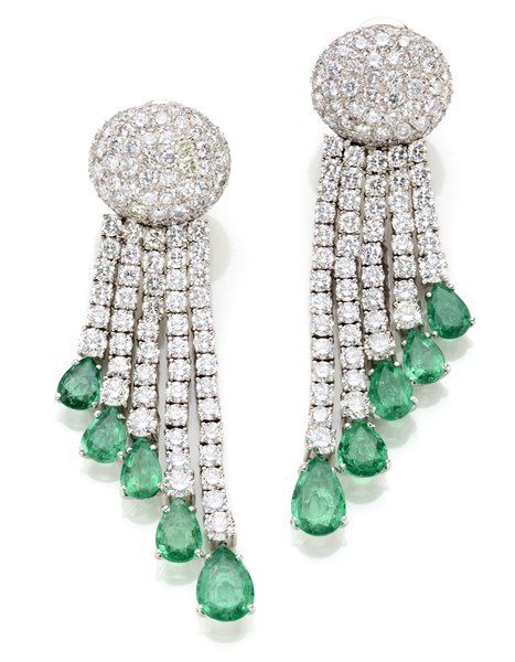 Orecchini pendenti a nappa in oro bianco con diamanti rotondi per complessivi ct. 18,86 circa e smeraldi a goccia per complessivi ct. 15,00 circa, g 46,70 circa, lungh. cm 17,40 circa. Con garanzia