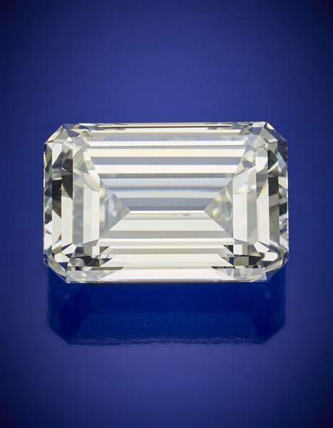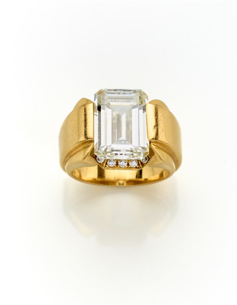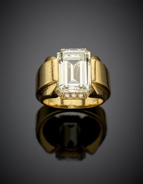 Anello in oro giallo con diamante ottagonale di ct. 8,45 rifinito con diamanti