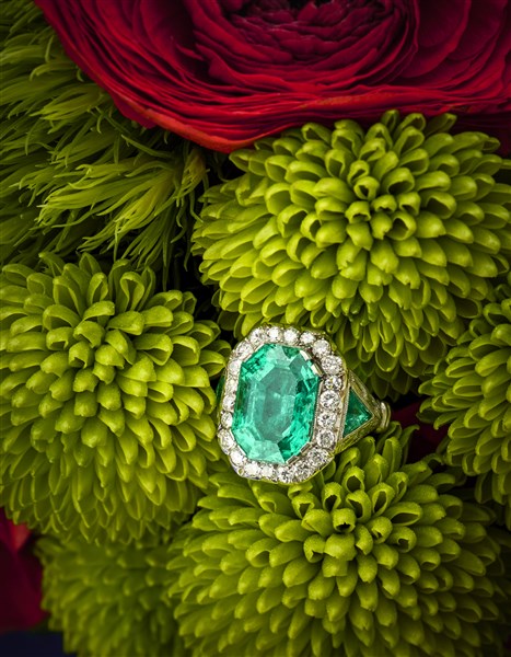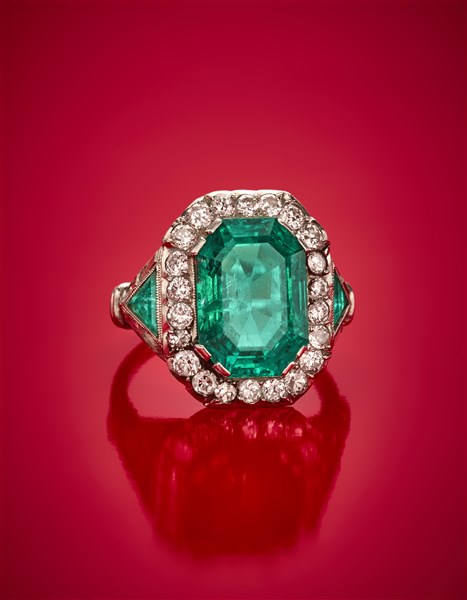 Anello in platino e diamanti con smeraldo ottagonale, g 6,34 c
