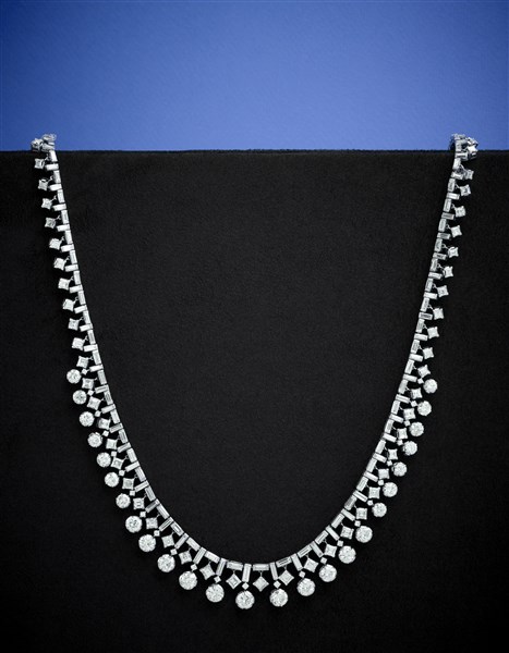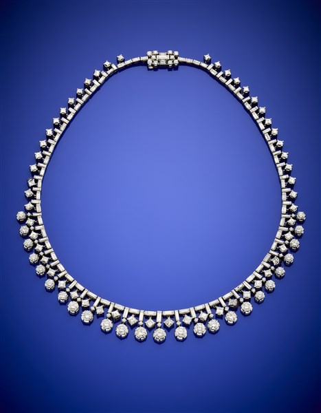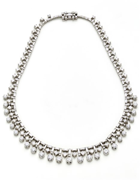 Collier in platino con diamanti rotondi, baguette e carré per complessivi ct. 32 circa, g 75,25 circa, lungh. cm 43 circa. (lievi difetti)