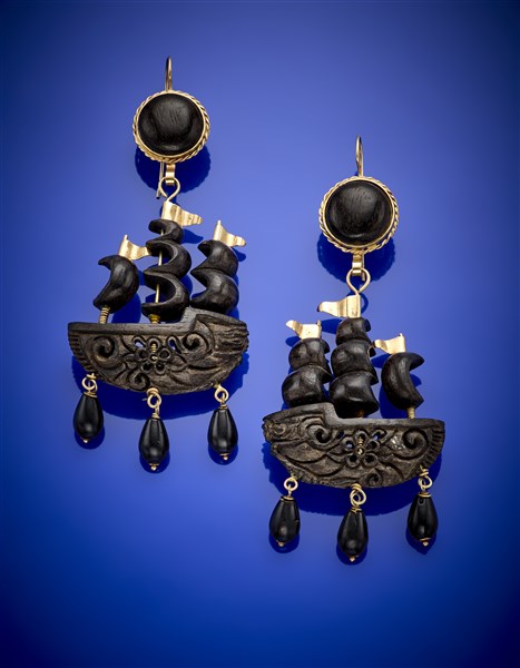 Orecchini pendenti in oro giallo 333/1000 e legno ebanizzato a guisa di veliero, g 24,66 circa, lungh. cm 10,60 circa.