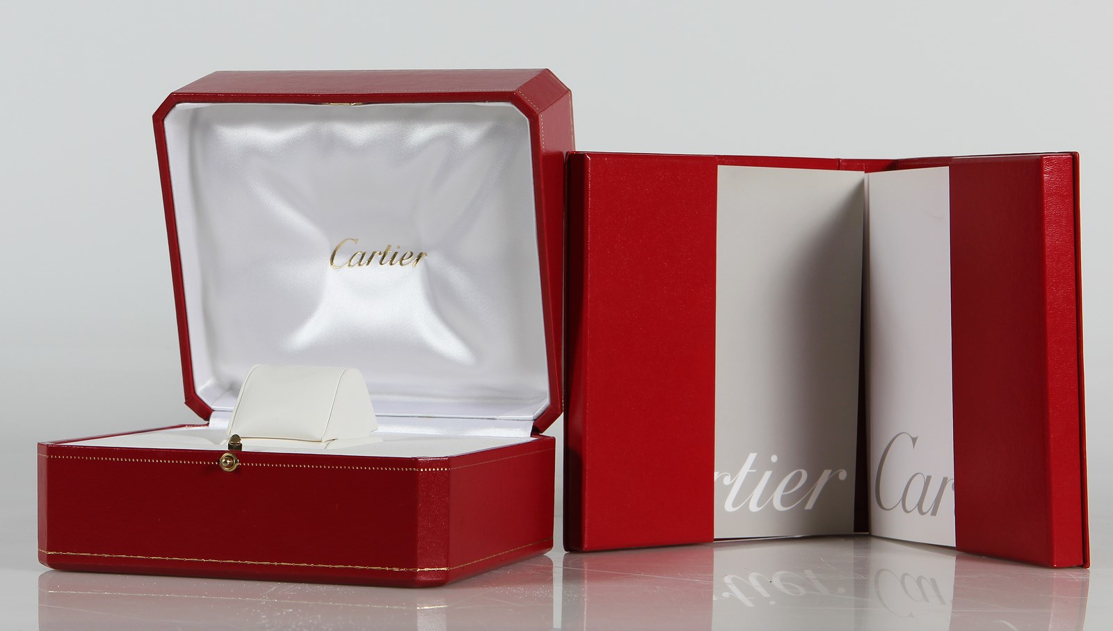 Cofanetti Cartier. 2005. Oggetto. . Cofanetto in finta pelle (15x13x8,5cm) destinato a contenere un orologio Cartier e contenitore in finta pelle (15x13x2,5cm) atto a custodire il certificato di garanzia e le istruzioni per l'uso dell'oggetto prezioso.