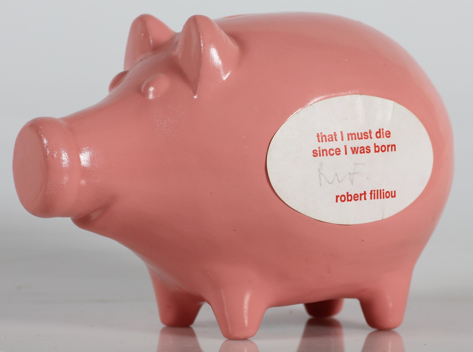 FILLIOU ROBERT (1926 - 1987) Oprtimistic Box n.4-5. Ceramica. Cm 10,00 x 16,00 x 8,00. Salvadanaio in ceramica. All'opera sono applicati due adesivi di carta riportanti le scritte serigrafate: One thing I learned since I was born-That I must die since I was born. Opera firmata a matita.