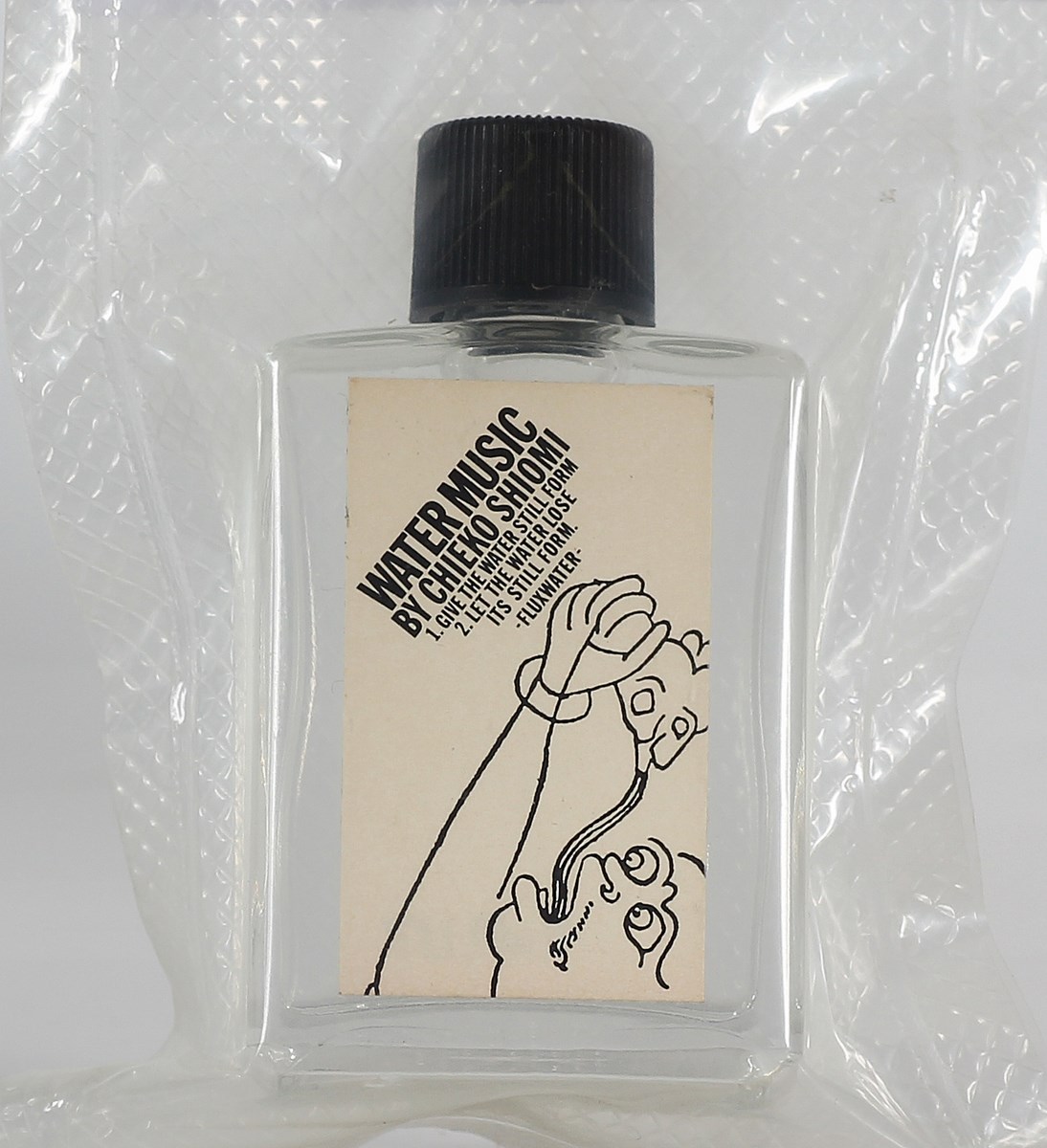 CHIEKO SHIOMI Water Music. Oggetto. Cm 3,50 x 6,00 x 2,00. Bottiglietta in vetro contenente acqua conservata sotto vuoto. Al fronte cartiglio descrittivo.